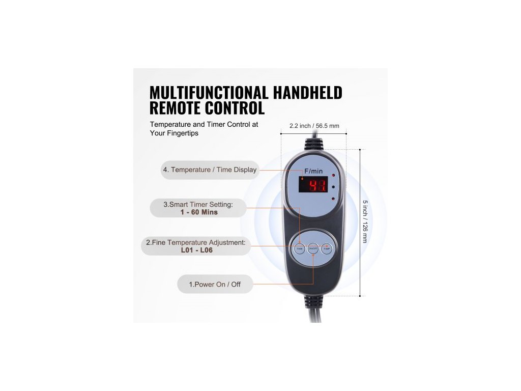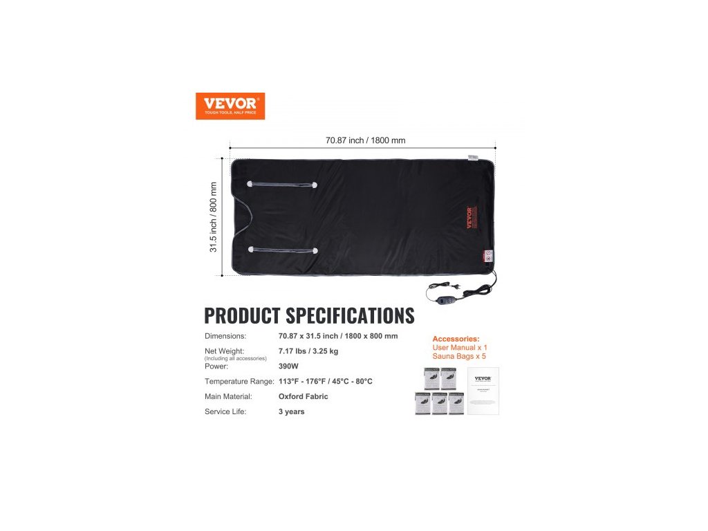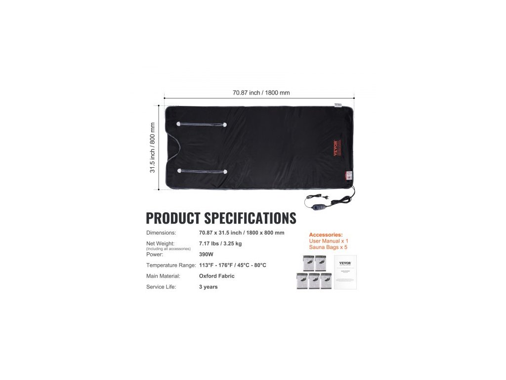 Životnost: 3 roky,Model: BW-802,Rozměry: 70,87 x 31,5 palce / 1800 x 800 mm,Teplotní rozsah: 1-6 úrovní (95°F-176°F / 35°C-80°C),Čistá hmotnost (včetně veškerého příslušenství): 7,17 lbs / 3,25 kg,Příkon: 390 W,Hlavní materiál: Oxfordská tkanina