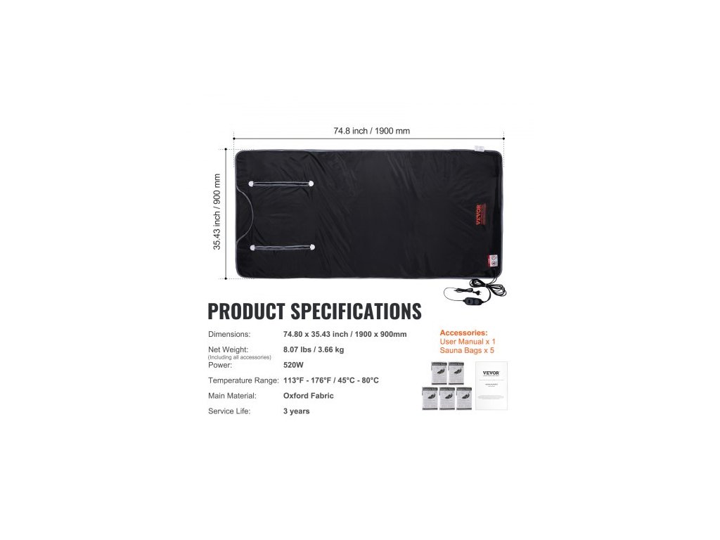 Životnost: 3 roky,Model: BW-802,Rozměry: 74,8 x 74,8 palce / 1900 x 900 mm,Teplotní rozsah: 1-6 úrovní (95°F-176°F / 35°C-80°C),Čistá hmotnost (včetně veškerého příslušenství): 9,07 lbs / 3,66 kg,Příkon: 520 W,Hlavní materiál: Oxfordská tkanina