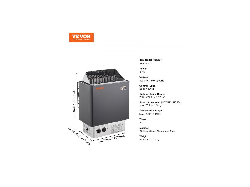 Časovač: 3 h,Typ ovládání: Vestavěný knoflík,Potřeba saunových kamenů (NENÍ SOUČÁSTÍ BALENÍ): Max. 15 kg,Napětí: 400V 3N~ 50Hz/60Hz,Číslo modelu: SCA-80NS,Teplotní rozsah: Max. 230℉ / 110℃,Materiál: Nerezová ocel, hliníkovaný zinek,Rozměry výrobku: 16,14 x 10,9 x 22,64 palce / 410 x 278 x 575 mm,Vhodná saunová místnost: 283-424 ft³ / 8-12 m³,Výkon: 8 kW,Hmotnost výrobku: 23,37 lbs / 10,6 kg