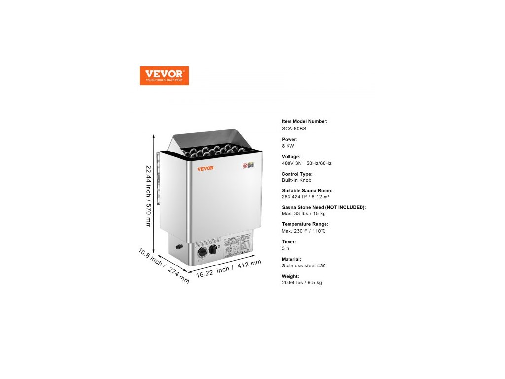 Časovač: 3 h,Typ ovládání: Vestavěný knoflík,Potřeba saunových kamenů (NENÍ SOUČÁSTÍ BALENÍ): Max. 15 kg,Napětí: 400V 3N~ 50Hz/60Hz,Číslo modelu: SCA-80BS,Teplotní rozsah: Max. 230℉ / 110℃,Materiál: Nerezová ocel 430,Rozměry položky: 16,22 x 10,8 x 22,44 palce / 412 x 274 x 570 mm,Vhodná saunová místnost: 283-424 ft³ / 8-12 m³,Výkon: 8 kW,Hmotnost položky: 20,94 lbs / 9,5 kg