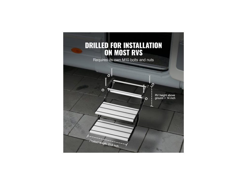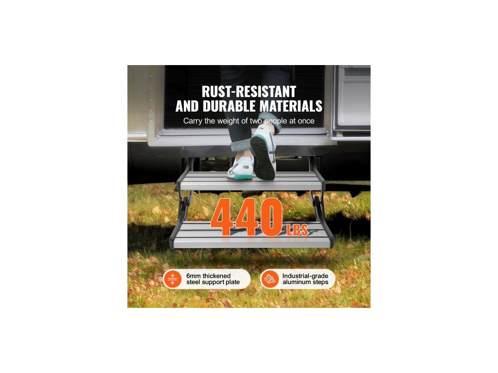 Schůdky pro obytné vozy, 2stupňové, manuální zatahovací schody pro obytné vozy, skládací, nosnost 440 liber, schody z hliníkové slitiny, zesílený ocelový plech, protiskluzové schody pro bezpečný vstup a výstup, schody pro obytné vozy, přívěsy a karavanyVrtání otvorů pro instalaci na obytném voze