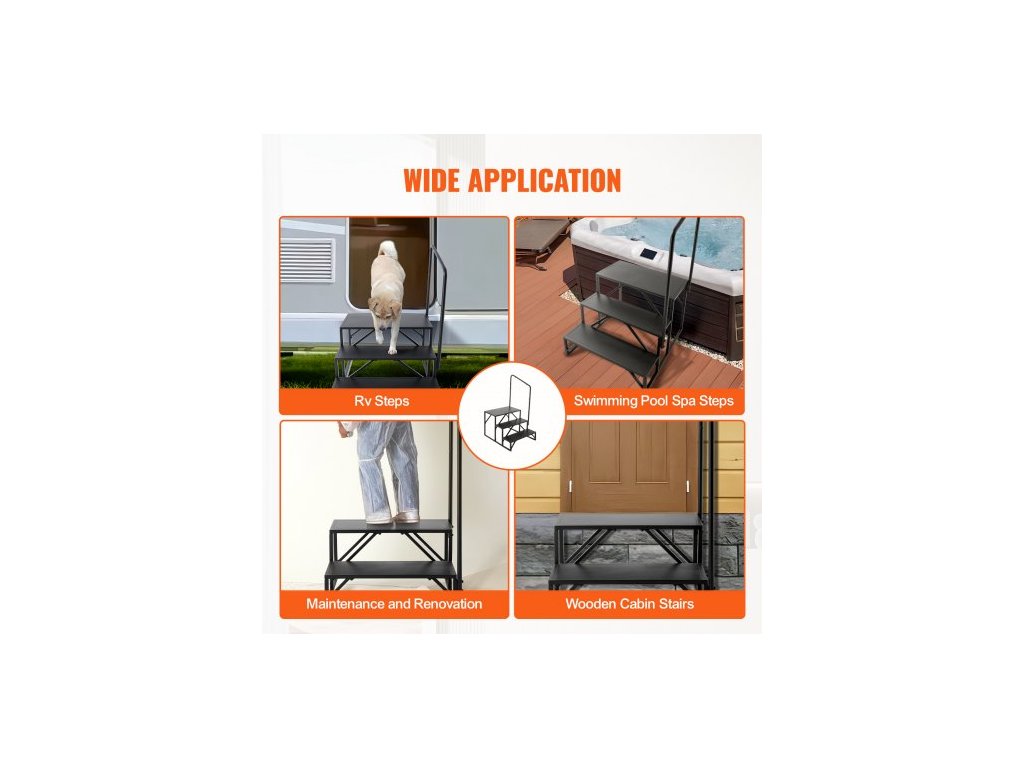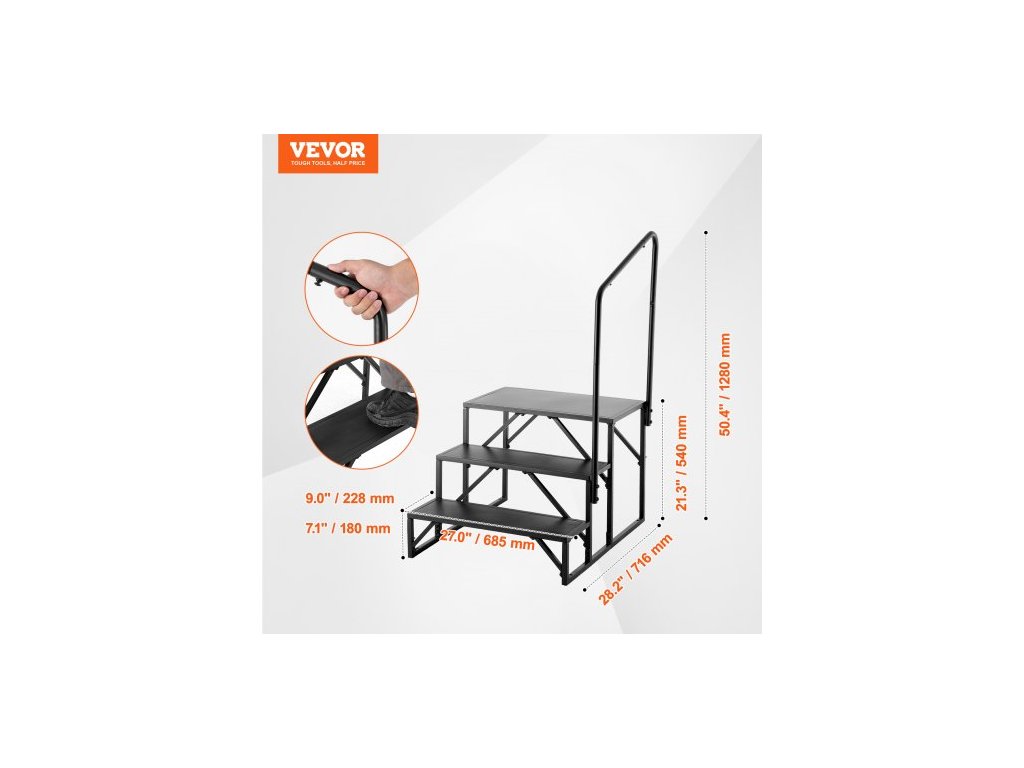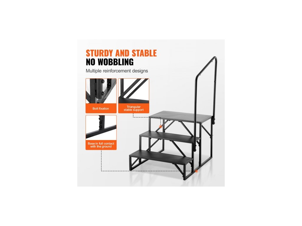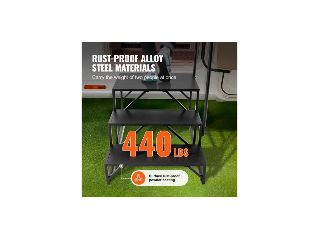 Schůdky pro obytné vozy, 3stupňové schody pro obytné vozy, nosnost 199,6 kg, zesílená uhlíková ocel, s madlem, protiskluzové schody pro bezpečný vstup a výstup, vhodné pro obytné vozy, přívěsy a karavanyVysoká nosnost a stabilita