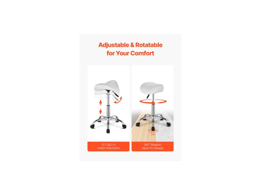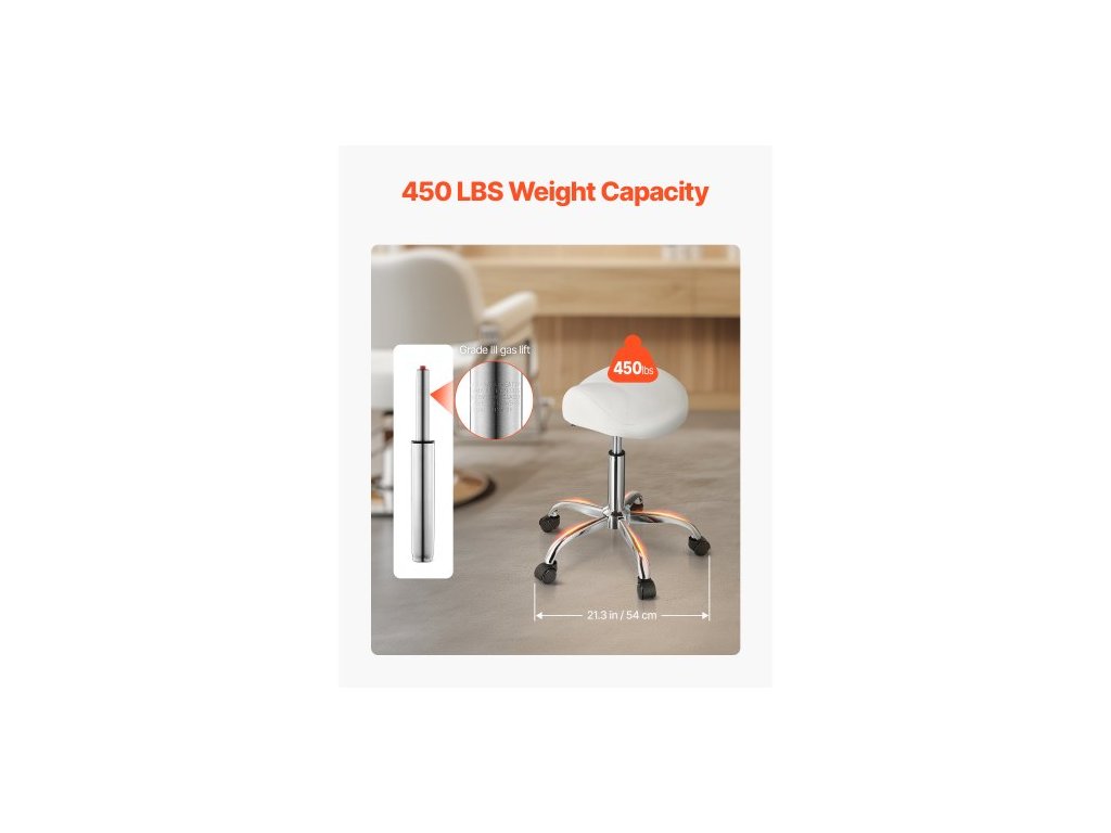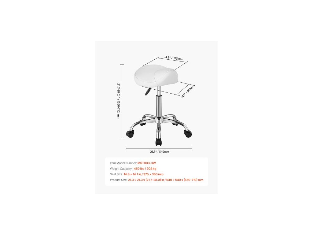 Hlavní materiály: PU kůže, houba, železo,Nastavitelná výška: 21,7-28,0 palců / 55-71 cm,Rozměry sedáku: 14,8 x 14,1 palců / 37,5 x 36 cm,Nosnost: 450 liber / 204 kg,Barva: Bílá,Číslo modelu položky: MST003-3W,Styl: Sedlová židle,Čistá hmotnost: 10,4 liber / 4,7 kg,Rozměry výrobku: 21,3 x 21,3 x (21,7–28,0) palců / 54 x 54 x (55–71) cm