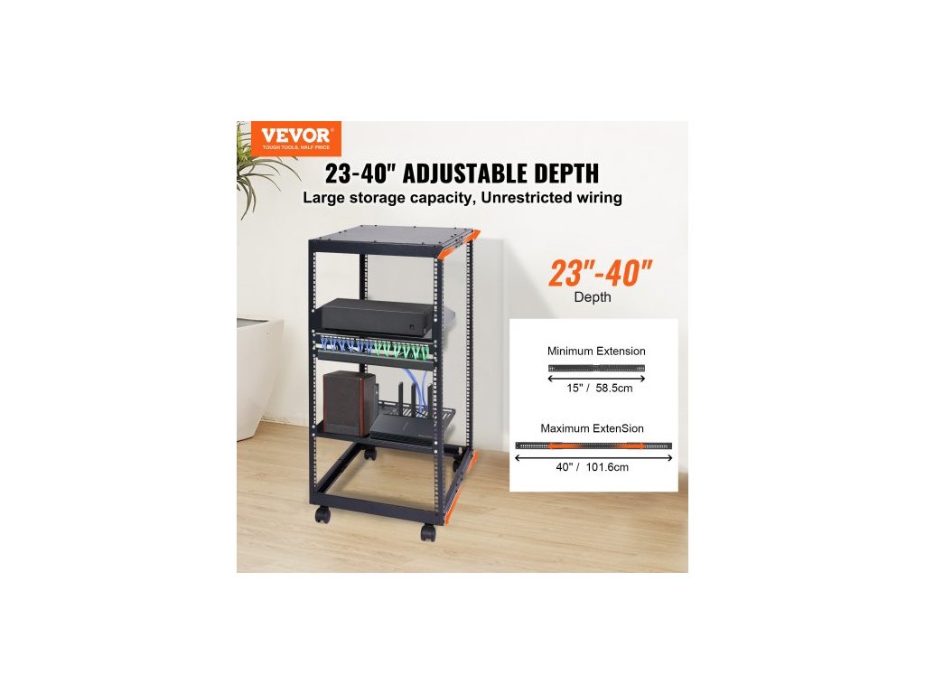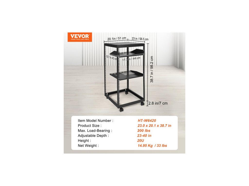 Nastavitelná hloubka: 23–40 palců, Barva: Černá, Číslo modelu položky: HT-W6420, Výška: 20U, Standardní šířka instalace: 19 palců, Čistá hmotnost: 33 lbs / 14,95 kg, Nástěnná nosnost: 500 lbs, Rozměry výrobku: 23 x 20,1 x 38,7 palců / 58 x 510 x 982 mm