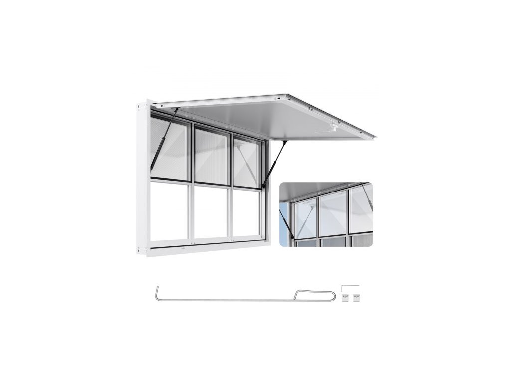 Okénko pro občerstvení 152x92 cm, servisní okénko z hliníkové slitiny pro pojízdné občerstvení, servírovací okénko s úhlem výklopu až 85 stupňů, 6 posuvnými okny, markýzou a tažným hákem, pro občerstvovací přívěsyHydraulická tyč