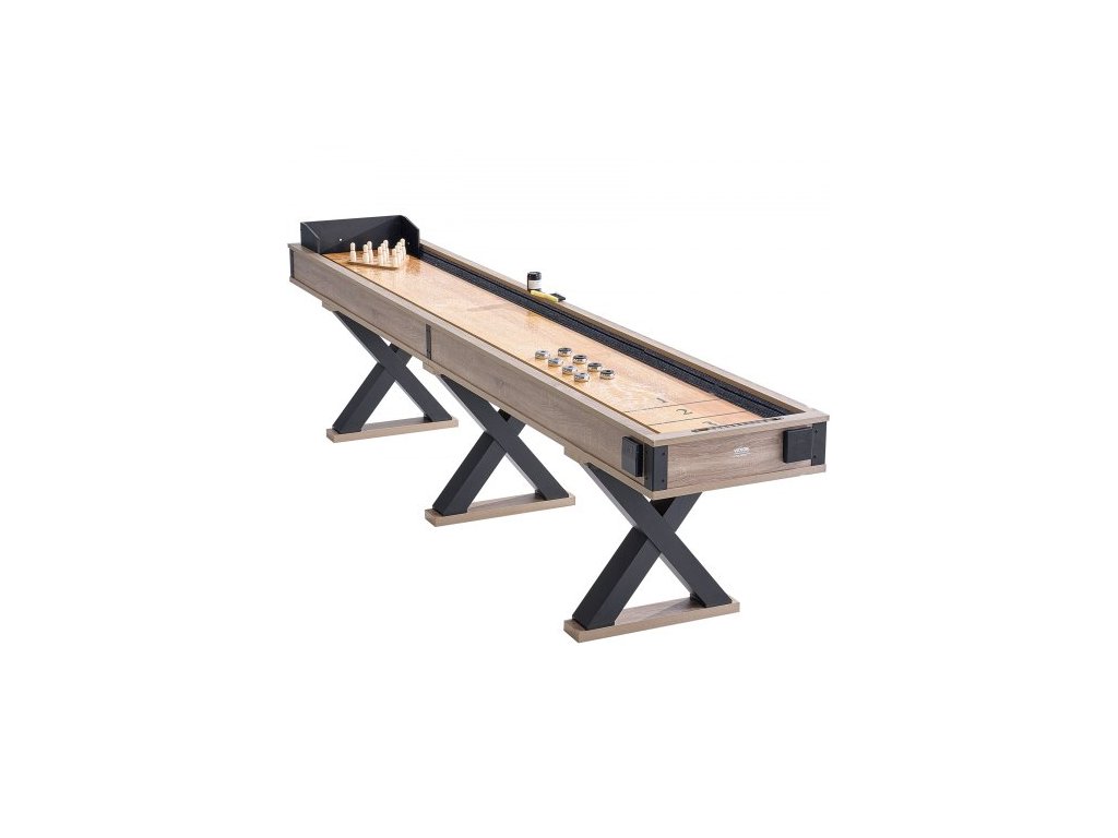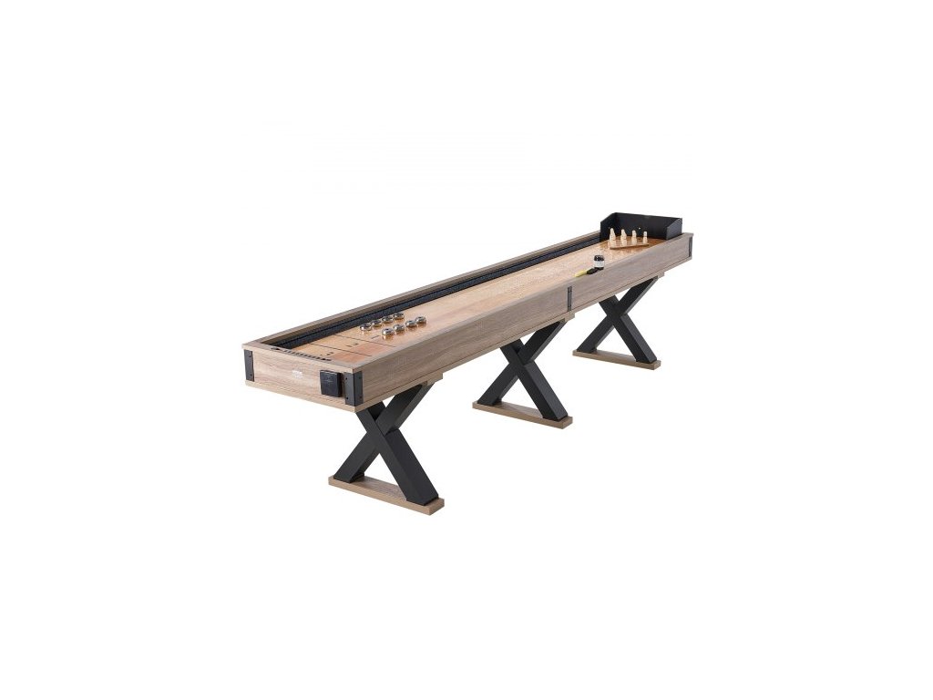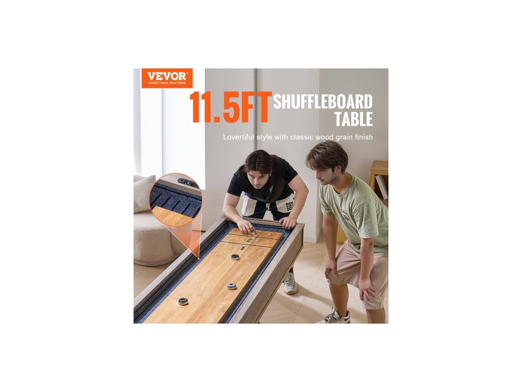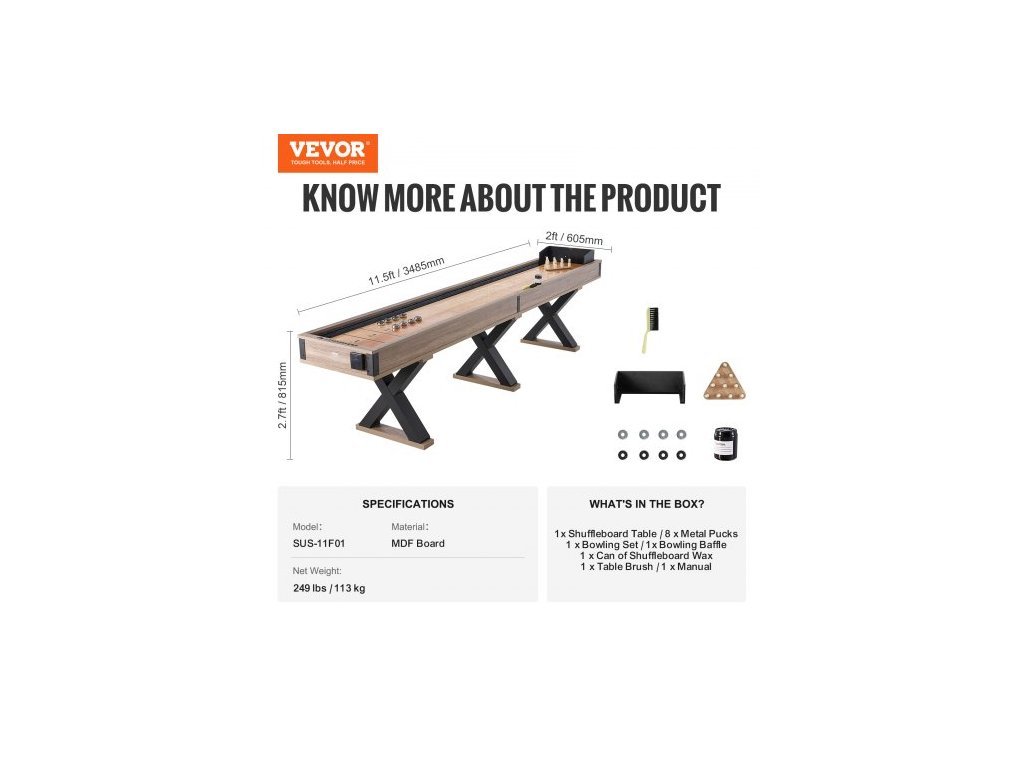 Shuffleboard stůl, 11,5 ft shuffleboard pro rodinné herny, herní sada 2 v 1 shuffleboard a bowling, s hrací plochou odolnou proti poškrábání, nohami, 8 puky, bowlingovou sadou, voskem a kartáčem na stůlOboustranný stůl