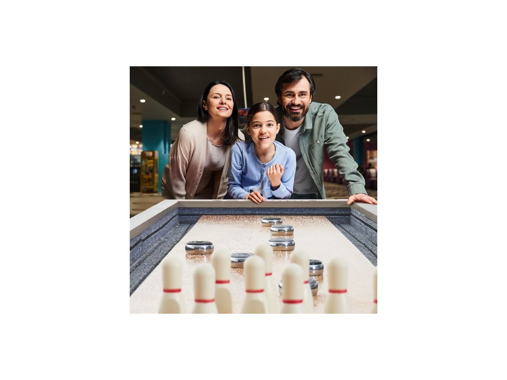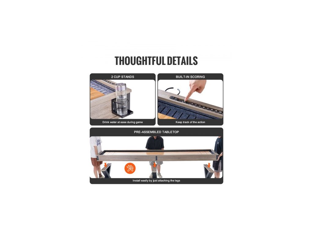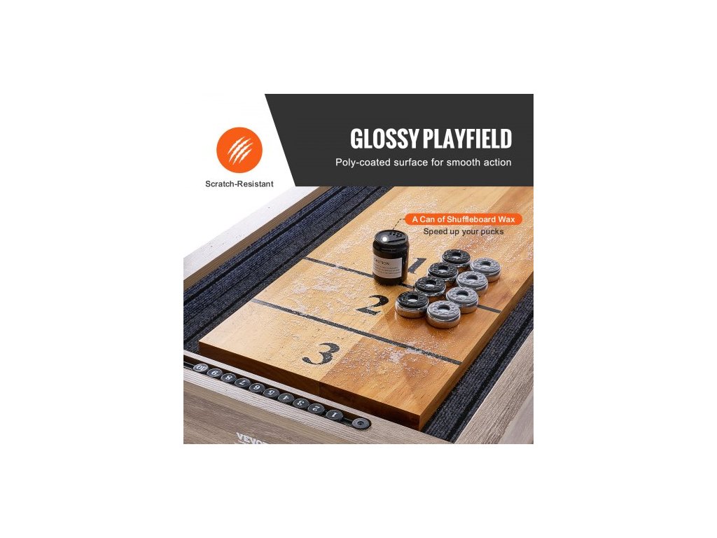 shuffleboardový stůl, 11,5 stop dlouhý shuffleboard pro rodinné herny, herní sada 2 v 1 - shuffleboard a bowling, s hrací plochou odolnou proti poškrábání, nohami, 8 puky, bowlingovou sadou, voskem a kartáčem na stůl