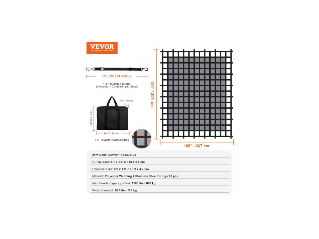 Průměr vnitřního kroužku S-háku: 0,1 palce / 30 mm,Rozměr S-háku: 4,1 x 1,6 palce / 105 x 40 mm,Nastavitelná velikost popruhu: 13 - 59 palců / 330 - 1500 mm,Rozměr karabiny: 3,9 x 1,9 palce / 99 x 47 mm,Maximální tažná kapacita sítě: 1500 lbs / 680 kg, Velikost otvoru: 6,5 x 6,5 palce / 165 x 165 mm, Číslo modelu položky: PLCN120, Hmotnost výrobku: 20,5 lbs / 9,3 kg, Materiál: Polyesterový popruh + D-kroužky z nerezové oceli 16 ks, Čistá velikost nákladu: 120 x 105 palců / 3020 x 2670 mm, Rozměry výrobku: 121,7 x 106,3 x 0,4 palce / 3090 x 2700 x 10 mm (plně rozložený)