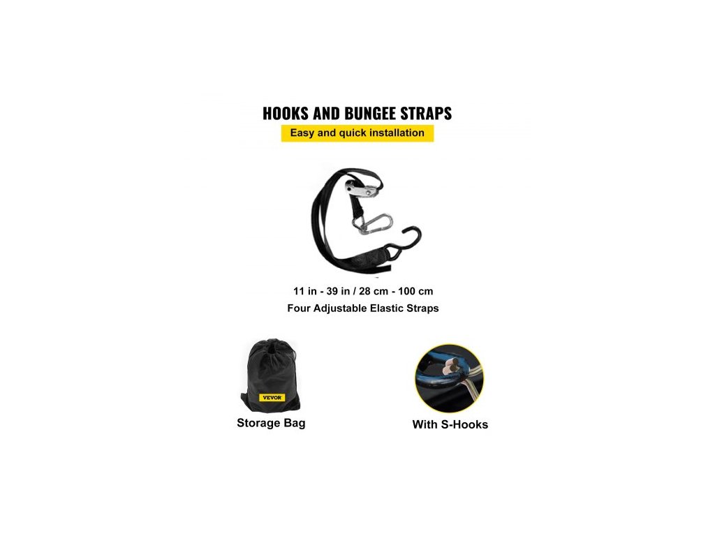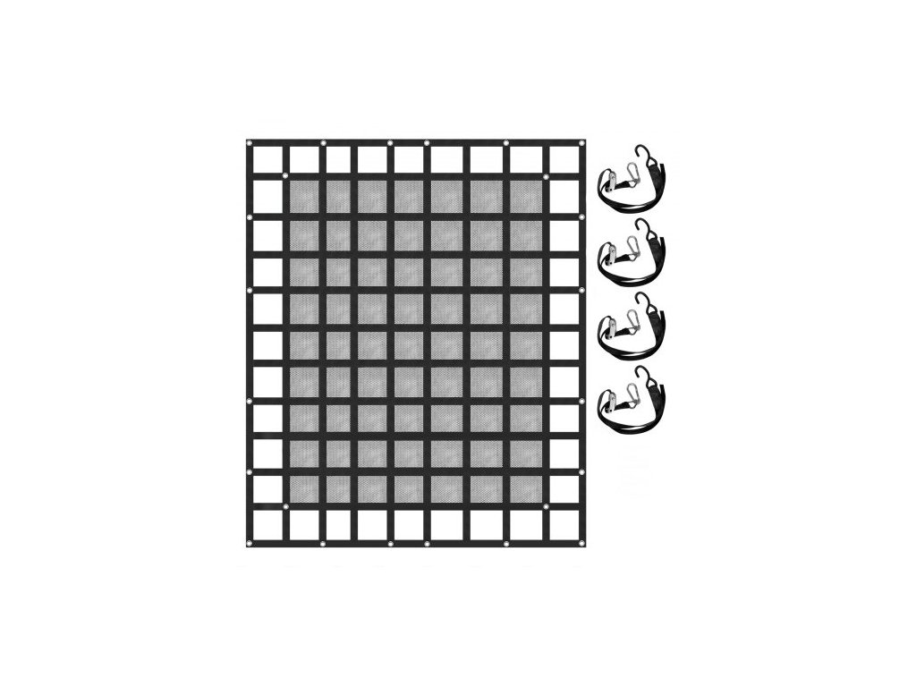 Nosnost: 500 kg/1100 liber, délka 4 S-hákových popruhů: 28-100 cm/11-39 palců, maximální pevnost v tahu: 2 T/4400 liber, rozměry sítě: 8×6,7 stop/244×205 cm, materiál: polyester, rozměr čtvercového otvoru: 6×6 palců/15×15 cm