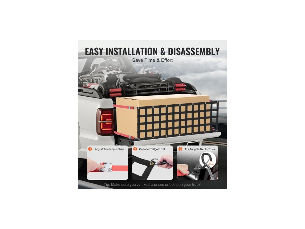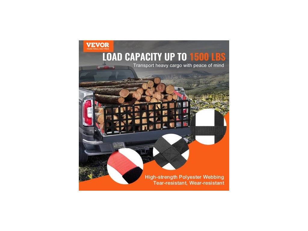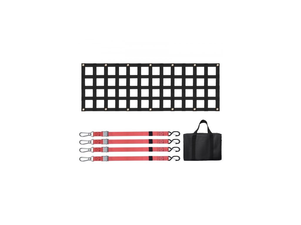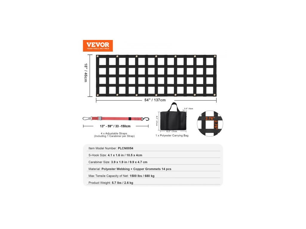 Rozměry S-háku: 4,1 x 1,6 palce / 105 x 40 mm,Nastavitelná velikost popruhu: 13 - 59 palců / 330 - 1500 mm,Rozměry karabiny: 3,9 x 1,9 palce / 99 x 47 mm,Maximální tažná nosnost sítě: 1500 lbs / 680 kg,Rozměry sítě na korbu nákladního prostoru: 54 x 18 palců / 1370 x 460 mm,Otvor Rozměry: 70 x 70 mm, Číslo modelu položky: PLCN0054, Hmotnost výrobku: 2,6 kg, Materiál: Polyesterový popruh + měděné průchodky 14 ks, Rozměry výrobku: 1390 x 470 x 7,5 mm (plně rozložené)