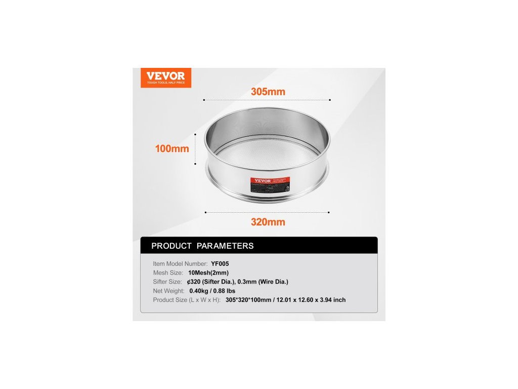 Rozměry výrobku (D x Š x V): 12,01 x 12,60 x 3,94 palce / 305 x 320 x 100 mm,Číslo modelu položky: YF005,Velikost síta: 320 mm (průměr síta), 0,3 mm (průměr drátu),Čistá hmotnost: 0,88 lbs / 0,4 kg,Velikost ok: 10 mesh (2 mm)