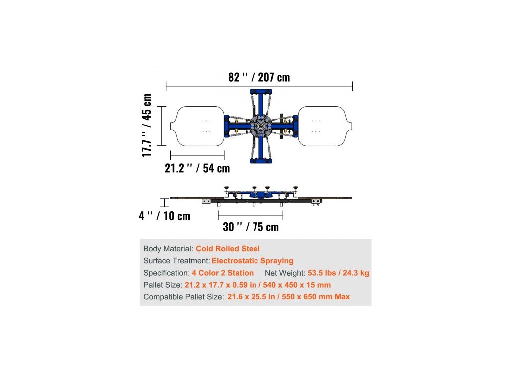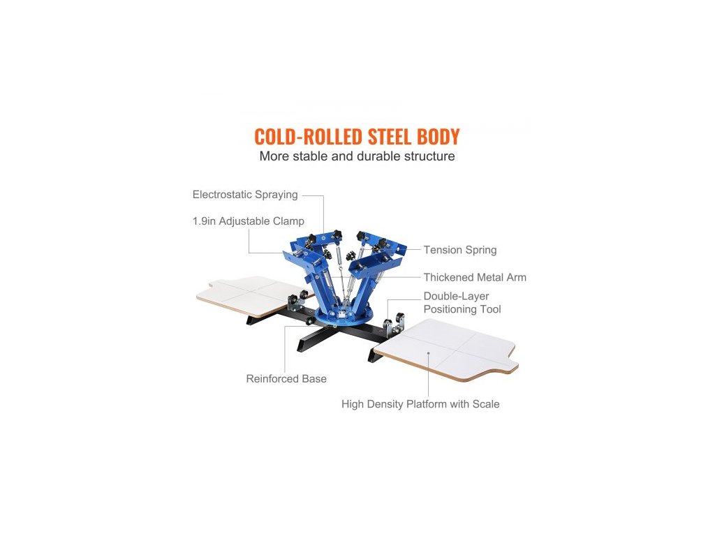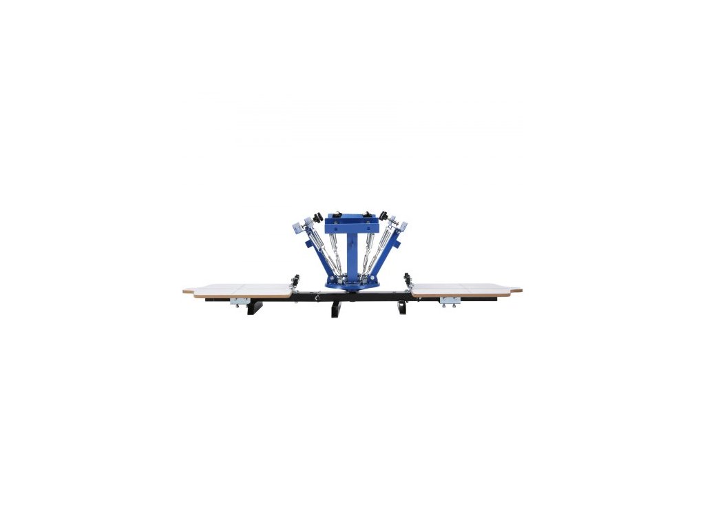 Sítotiskový stroj , 4barevný 2-staniční sítotiskový lis otočný o 360°, sítotiskový lis 21,2x17,7" / 54x45cm, dvouvrstvá polohovací paleta pro potisk triček vlastní výrobyDvojnásobná efektivita polohování