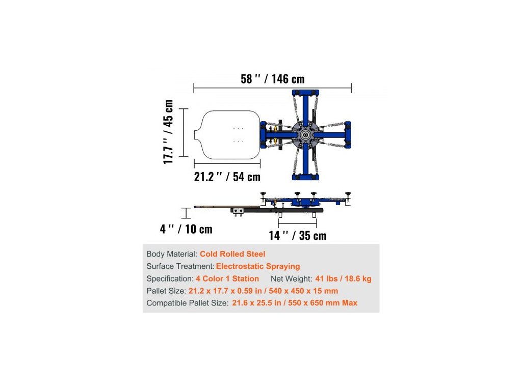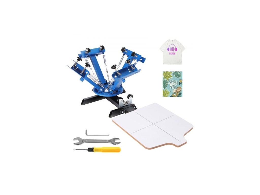 Sítotiskový stroj , 4barevný sítotiskový lis s 1 stanicí, otočný o 360°, sítotiskový lis 21,2x17,7 palce / 54x45 cm, dvouvrstvá polohovací paleta pro potisk triček