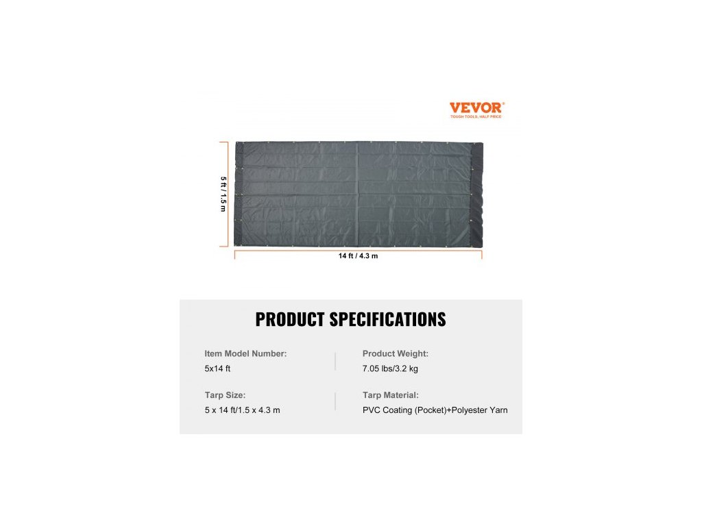 Rozměry plachty: 5 x 14 stop/1,5 x 4,3 m,Číslo modelu položky: 5x14 stop,Hmotnost výrobku: 7,05 liber/3,2 kg,Materiál plachty: PVC povlak (kapsa) + polyesterová příze