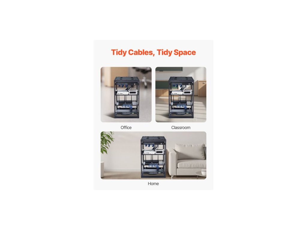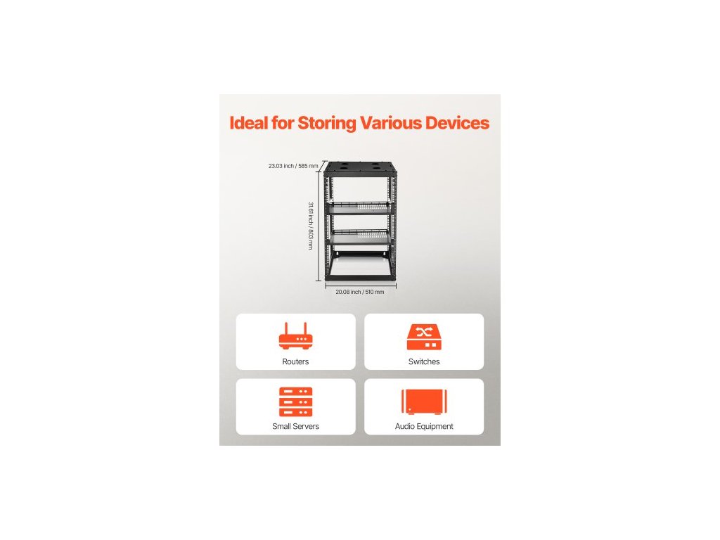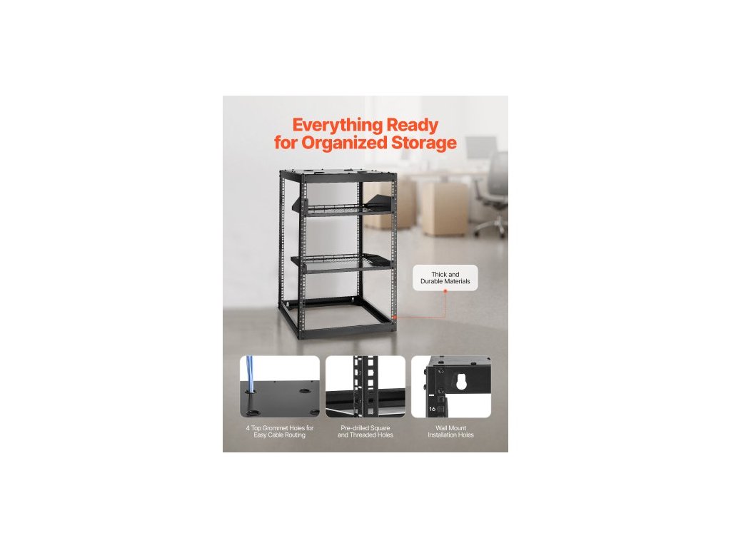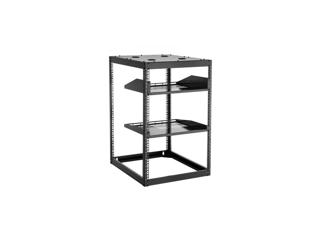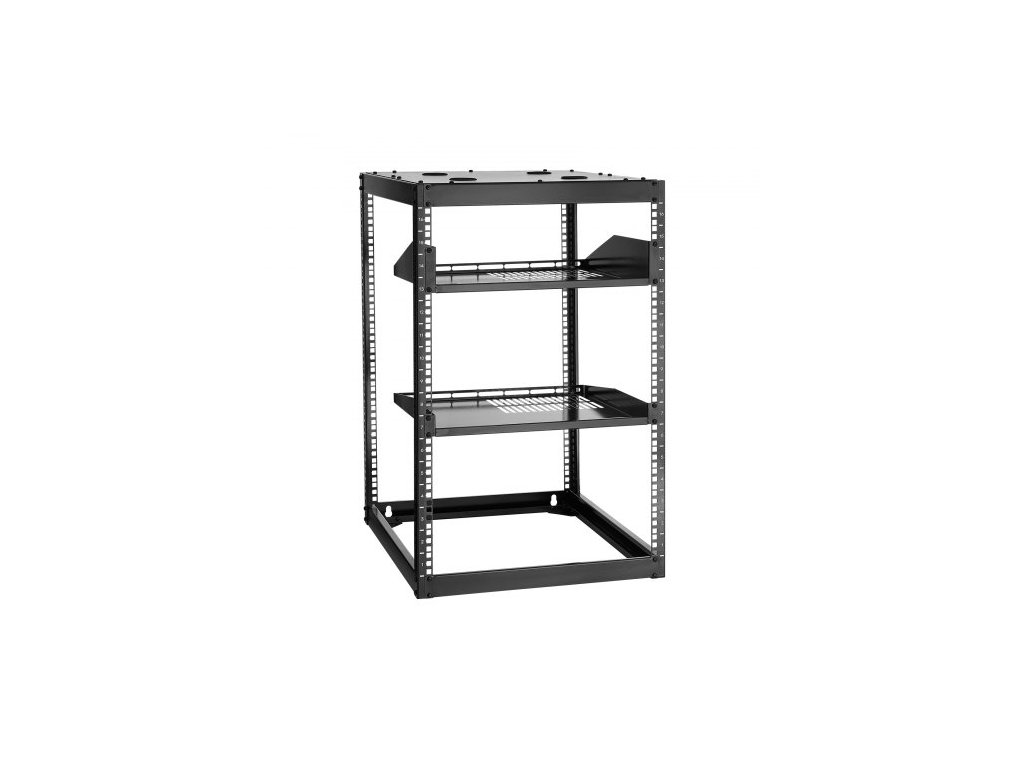 Síťový rack 16U s otevřeným rámem, hloubka 585 mm, nástěnný nebo stojící serverový rack, odolný, 4 sloupky, s odvětrávanými policemi a montážním materiálem, pojme veškeré vaše síťové IT vybavení a AV zařízeníMasivní uhlíková ocel