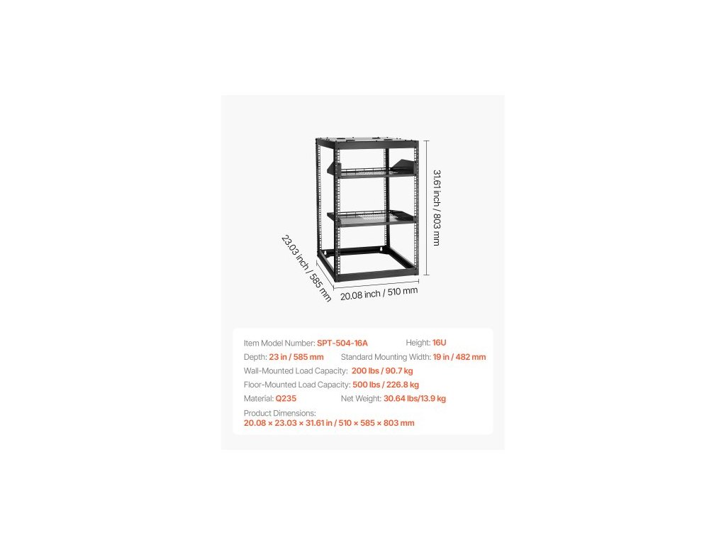 Číslo modelu položky: SPT-504-16A,Standardní montážní šířka: 482 mm,Nosnost při montáži na zeď: 90,7 kg,Výška: 16U,Nosnost při montáži na podlahu: 226,8 kg,Materiál: Q235,Hloubka: 585 mm