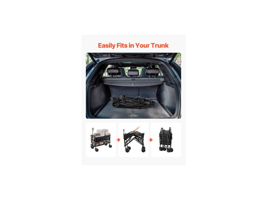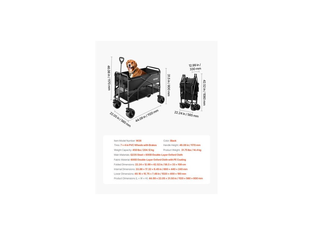Hlavní materiály: ocel Q235 + dvouvrstvá oxfordská tkanina 600D, nosnost: 204,12 kg, horní rozměry: 860 mm x 440 mm x 240 mm, barva: černá, výška rukojeti: 1170 mm, číslo modelu: W26, hmotnost výrobku: 14,4 kg, Pneumatiky: PVC kola 7 palců x 4 palce s brzdami, Rozměry výrobku (D x Š x V): 1120 mm x 560 mm x 800 mm, Rozměry ve složeném stavu: 56,5 × 33 × 108 cm, Rozměry ve spodní části: 1020 mm x 400 mm x 190 mm, Materiál: Dvouvrstvá oxfordská tkanina 600D s PE povlakem