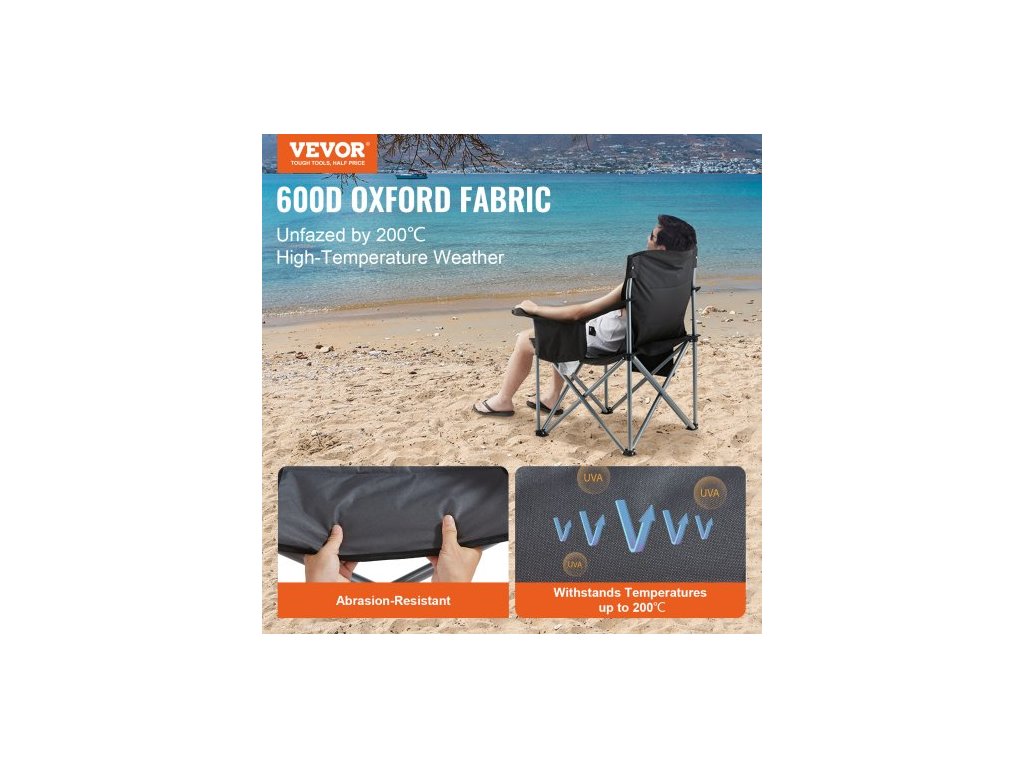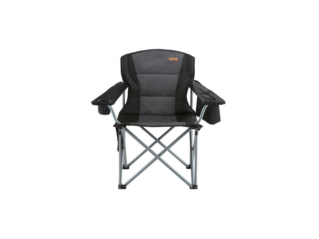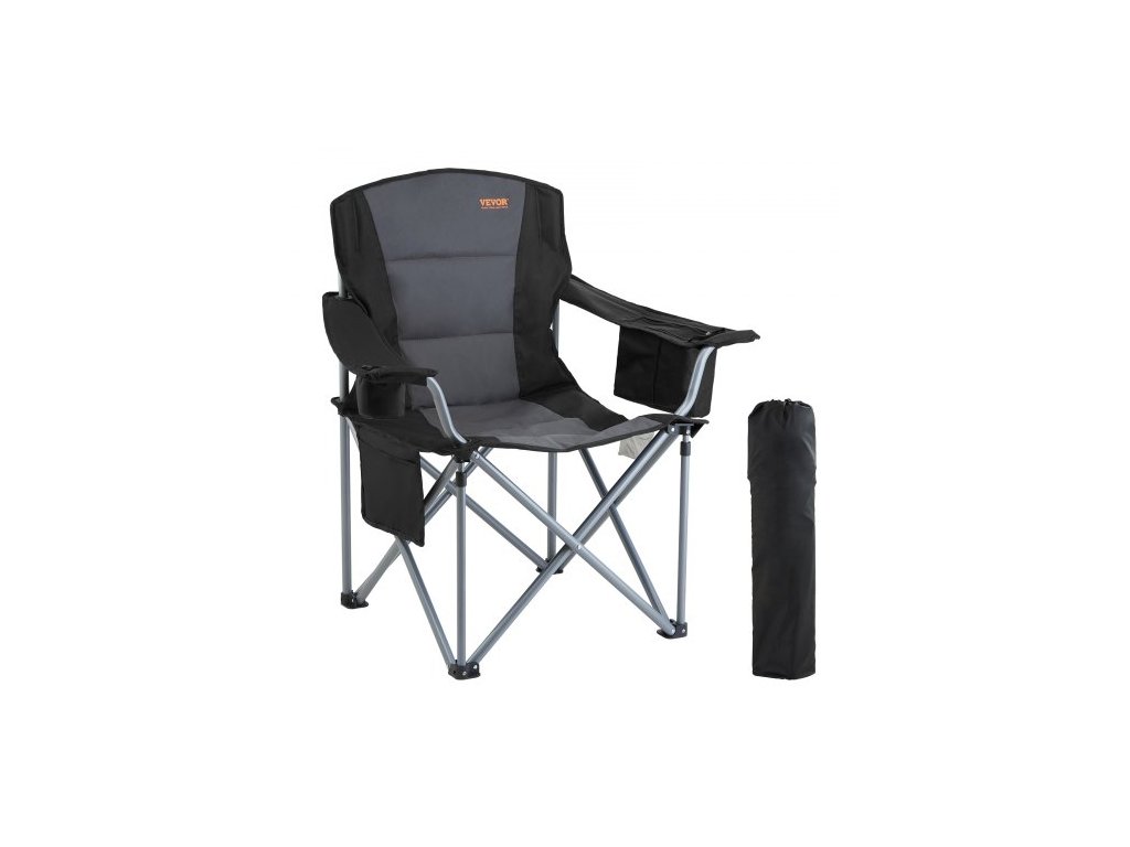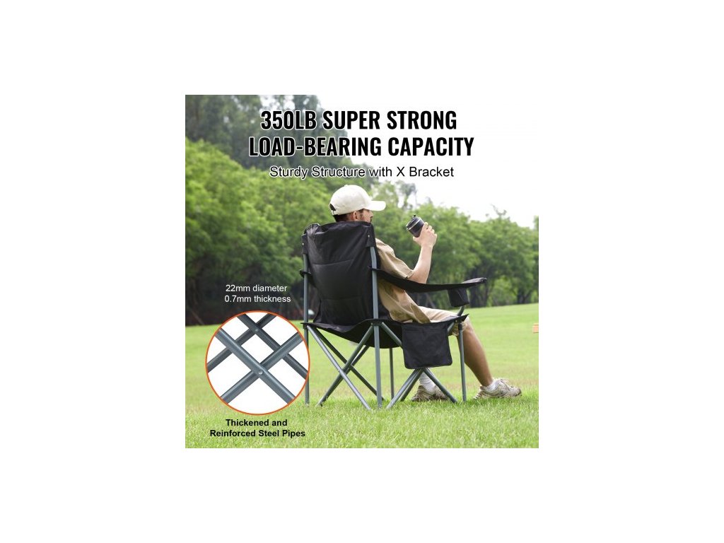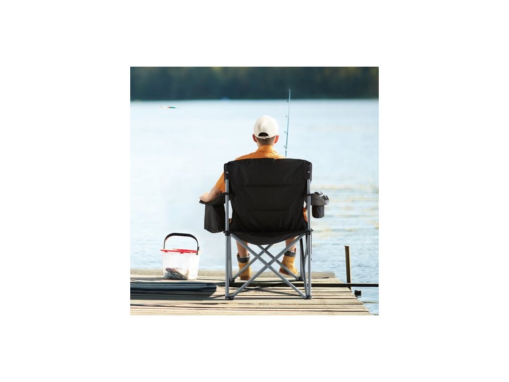 Skládací kempingová židle pro dospělé, přenosná odolná venkovní křesla s polstrovanými bederními opěradly a bočními kapsami, držákem na nápoje a chladicí taškou na pláž, trávník, piknik, rybaření, turistiku, černáSilná nosnost 150 kg