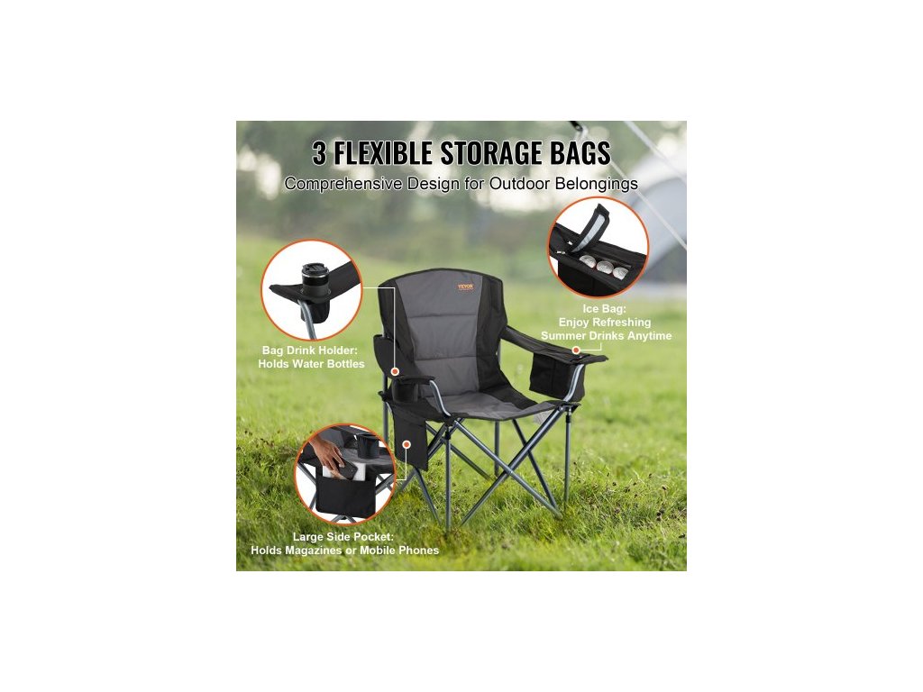 Skládací kempingová židle pro dospělé, přenosná odolná venkovní křesla s polstrovanými bederními opěrkami a bočními kapsami, držákem na nápoje a chladicí taškou na pláž, trávník, piknik, rybaření, turistiku, černá