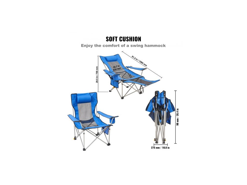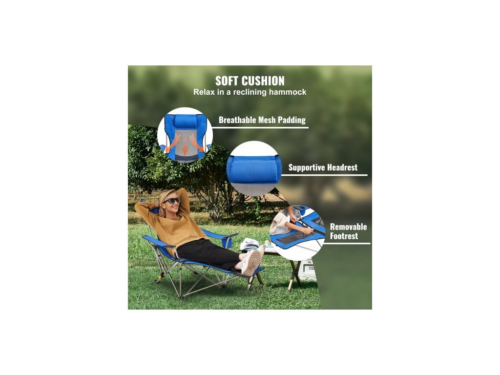 Nosnost: 149,69 kg, Barva: Modrá, Číslo modelu položky: HKC-1001P-1, Hmotnost výrobku: 4,45 kg, Rozměry výrobku: 1530 x 830 x 730 mm / 60,24" x 32,68" x 28,74" (v polohovací poloze), Hlavní materiál: Legovaná ocel + síťovina, Nastavení opěradla: 4stupňové nastavitelné
