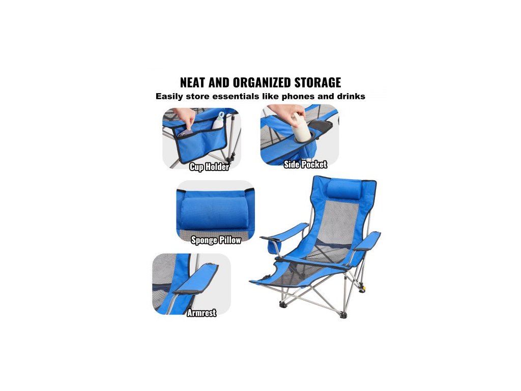 Skládací kempingová židle , skládací kempingová židle s nosností 150 kg, přenosná kempingová židle s opěrkou nohou, držákem na nápoje, boční kapsou a opěrkou hlavy, pro kempování, rybaření a outdoorové aktivity