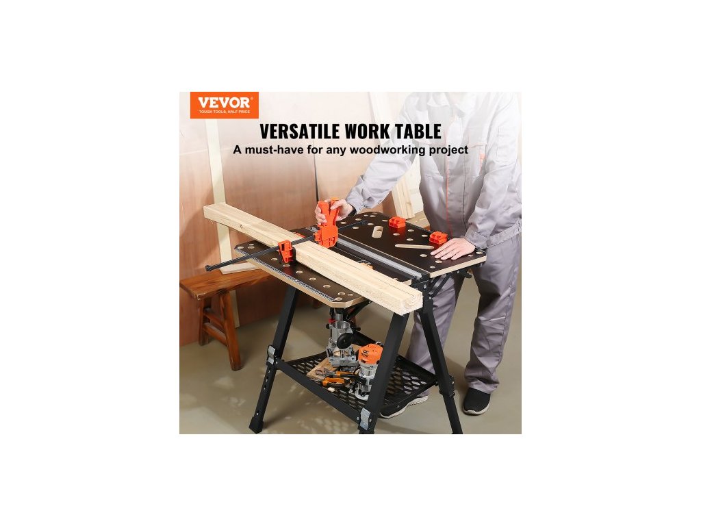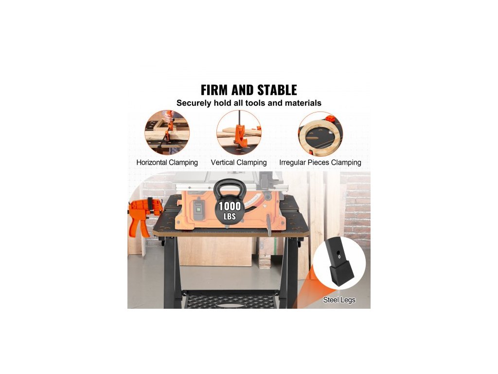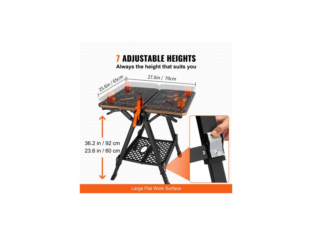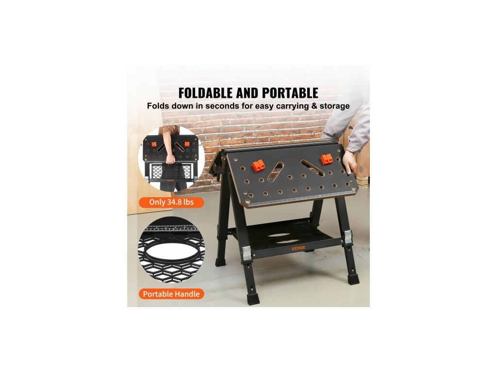 Skládací pracovní stůl , 2 v 1 jako koza a pracovní stůl, nosnost 453 kg, 7 nastavitelných výšek, ocelové nohy, přenosný skládací stojan na nářadí s dřevěnou svorkou, 4 úchyty na stůl, 2 háky, snadné skladování v garážiVezměte si svůj pracovní stůl kamkoli potřebujete! Náš skládací pracovní stůl lze složit během několika sekund a snadno jej uložit do těsných prostor, jako jsou rohy nebo pod postele.