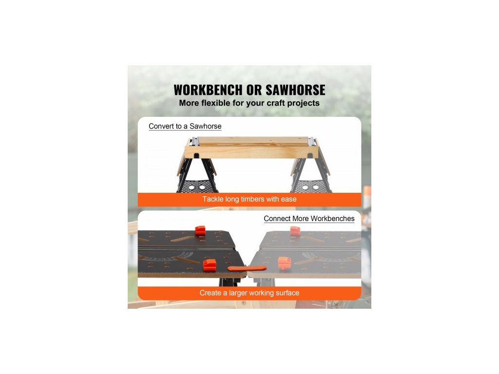 Skládací pracovní stůl , 2 v 1 jako koza na řezání a pracovní stůl, nosnost 450 kg, 7 nastavitelných výšek, ocelové nohy, přenosný skládací stojan na nářadí s dřevěnou svorkou, 4 upínací úchyty, 2 háky, snadné skladování v garáži