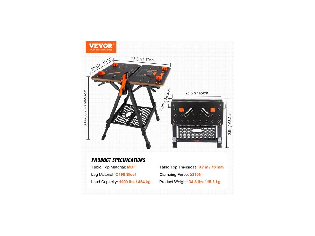 Rozměry desky stolu: 70 x 65 cm,Upínací síla: ≥210 N,Materiál desky stolu: MDF,Nastavitelná výška: 60–92 cm,Nosnost: 454 kg,Materiál nohou:Ocel Q195,Číslo modelu: YH-WB050,Hmotnost výrobku: 15,8 kg,Tloušťka desky stolu: 18 mm,Rozměry ve složeném stavu (D x Š x V): 65 x 63,5 x 18,5 cm