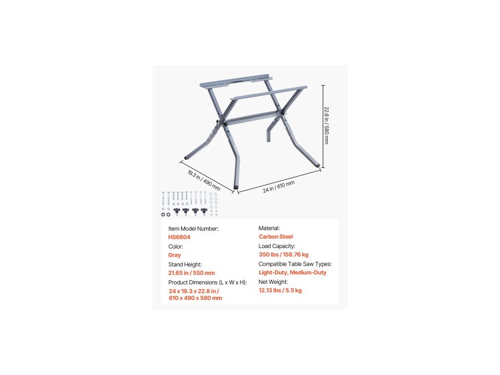 Kompatibilní typy stolních pil: Lehké, Středně těžké, Nosnost: 158,76 kg, Barva: Šedá, Číslo modelu položky: HS6804, Materiál: Uhlíková ocel, Rozměry výrobku (D x Š x V): 610 x 490 x 580 mm, Čistá hmotnost: 5,5 kg, Výška stojanu: 21,65 palce / 550 mm