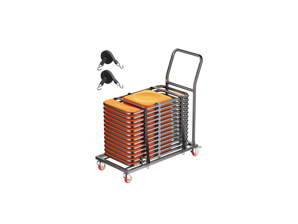 Skládací stojan na židle , nosnost 136 kg, vodorovný vozík na židle ve tvaru L pro 25 židlí, odolný kovový úložný vozík na židle s gumovými kolečky a držáky, velký držák na židle, matně černáZávěsná ramena