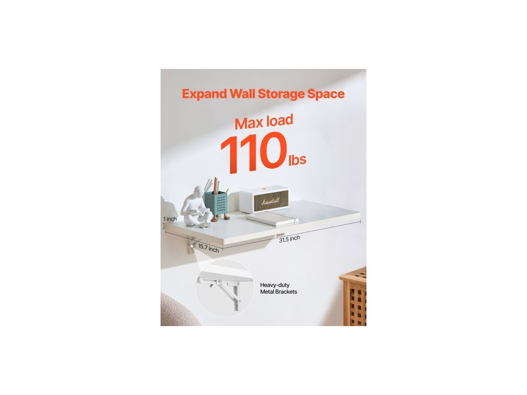 Skládací stůl k montáži na zeď, 31,5 x 15,7 palců, plovoucí stůl s železným držákem, skládací stůl pro malé prostory, domácí kancelář, jídelnu, prádelnu, kuchyň, bar, bílýStylové a praktické