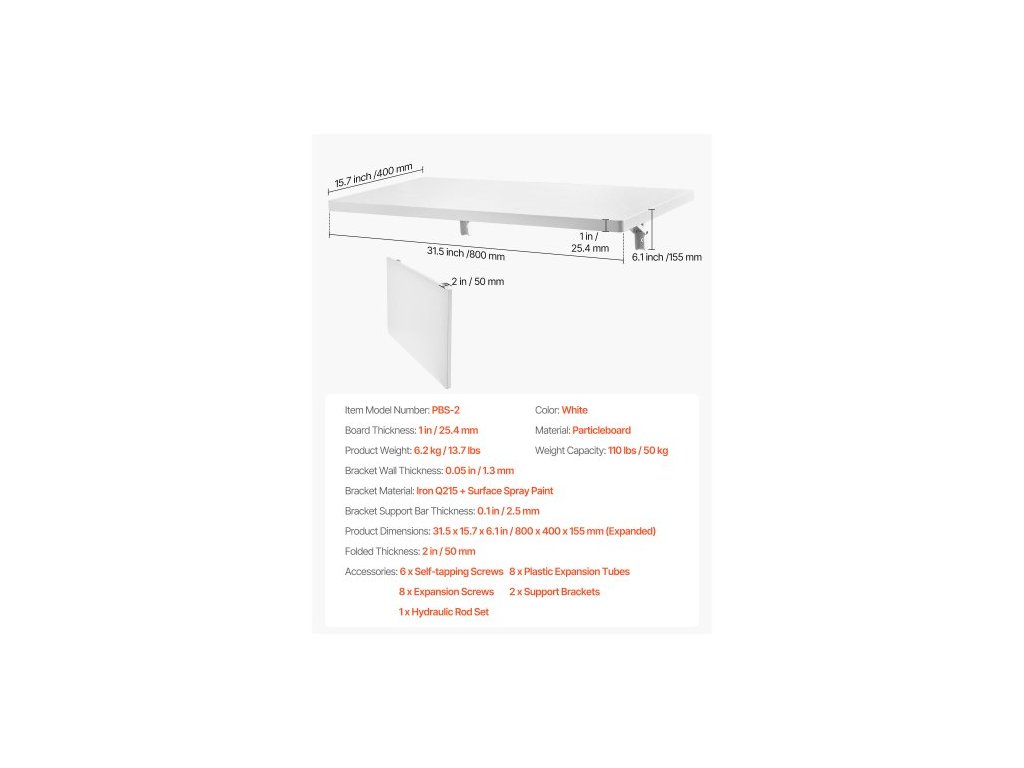 Rozměry výrobku (rozložený): 31,50 x 15,75 x 6,10 palců/800 x 400 x 155 mm,Povrchová úprava držáku: Barva,Nosnost: 110 lbs/50 kg,Rozměr: 31,50 x 15,75 palců/800 x 400 mm,Číslo modelu položky: PBS-2,Hmotnost výrobku: 13,67 lbs/6,2 kg,Materiál: Dřevotříska,Materiál držáku: Železo Q215, Tloušťka desky: 25,4 mm