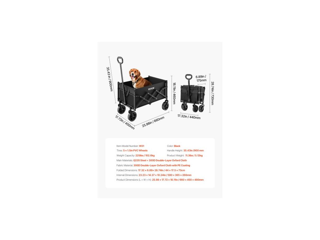 Hlavní materiály: ocel Q235 + dvouvrstvá oxfordská tkanina 300D, nosnost: 225 lbs / 102,06 kg, barva: černá, výška rukojeti: 35,43 palce / 900 mm, číslo modelu položky: W21, hmotnost výrobku: 11,29 lbs / 5,12 kg, pneumatiky: PVC kola 5 palců x 1,5 palce, rozměry výrobku (D x Š x V): 25,98 palce x 660 mm x 450 mm x 460 mm, Rozměry ve složeném stavu: 44 × 17,5 × 73 cm, Vnitřní rozměry: 590 mm x 365 mm x 260 mm, Materiál: Dvouvrstvá oxfordská tkanina 300D s PE povlakem