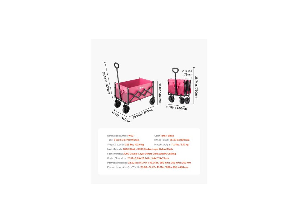 Hlavní materiály: ocel Q235 + dvouvrstvá oxfordská tkanina 300D, nosnost: 225 lbs / 102,6 kg, barva: růžová + černá, výška rukojeti: 35,43 palce / 900 mm, číslo modelu: W21, hmotnost výrobku: 11,3 lbs / 5,12 kg, pneumatiky: PVC kola 5 palců x 1,5 palce, rozměry výrobku (D x Š x V): 25,98 Rozměry ve složeném stavu: 660 mm x 450 mm x 460 mm, Rozměry ve složeném stavu: 44 cm x 34 cm x 17,5 cm, Vnitřní rozměry: 590 mm x 365 mm x 260 mm, Materiál: Dvouvrstvá oxfordská tkanina 300D s PE povlakem