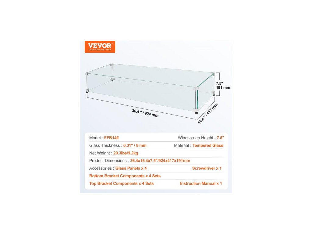 Skleněná větrná clona pro obdélníkový stůl na ohniště 924 x 417 x 191 mm, 8 mm silný a robustní tvrzený skleněný panel s rohovým držákem z tvrdého hliníku a gumovými nožičkami, snadná montážVětruodolná, stabilní a bezpečná
