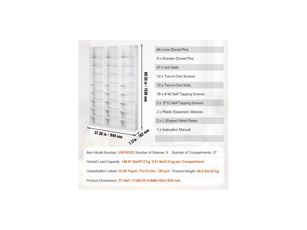 Počet polic: 9, Počet přihrádek: 27, Barva: Bílá, Číslo modelu položky: USF00102, Hmotnost výrobku: 22 kg, Klasifikační štítky: Kraftový papír, 71x12 mm, 120 ks, Rozměry výrobku: 949x182x1538 mm, Celková nosnost: 67,5 kg, 5,51 2,5 kg na přihrádku