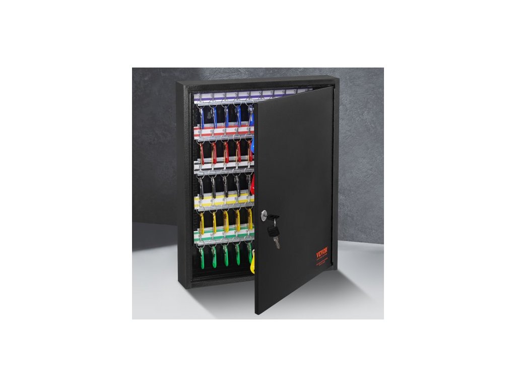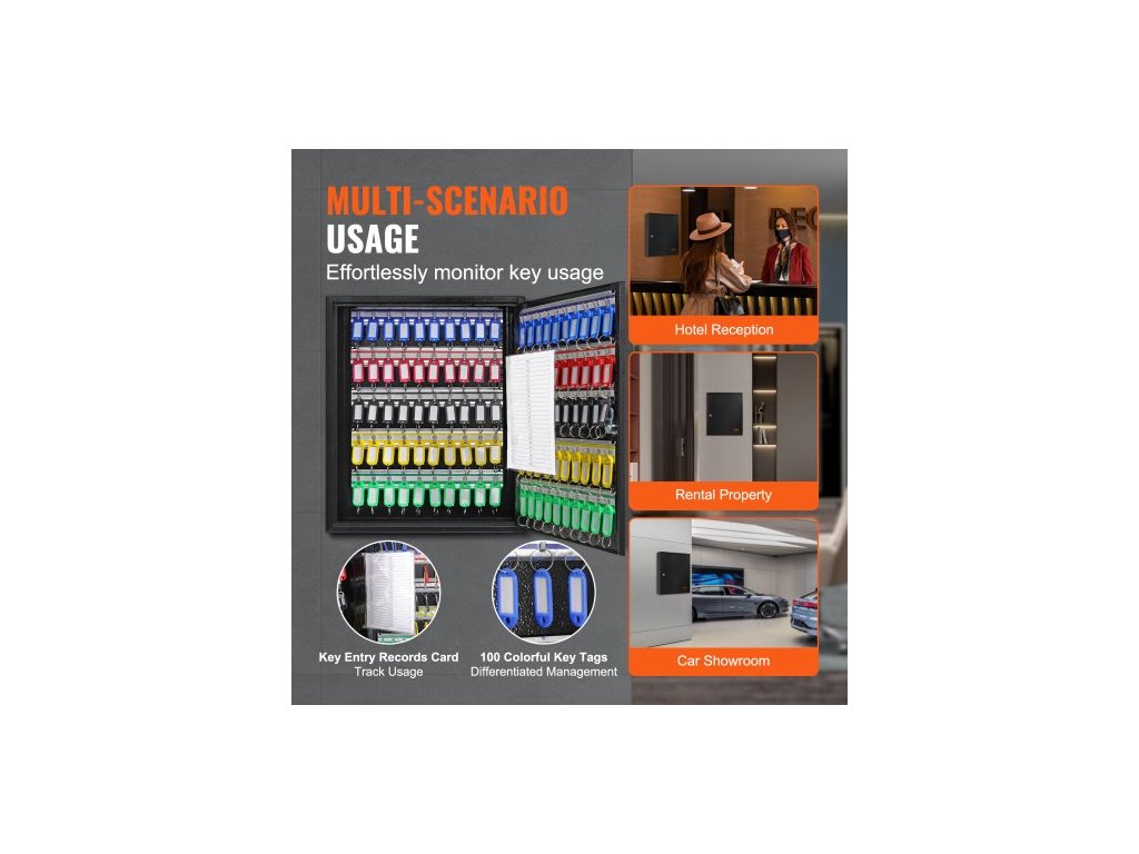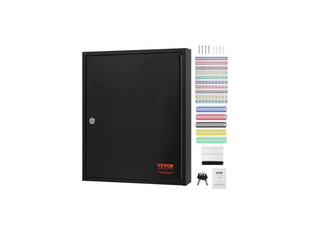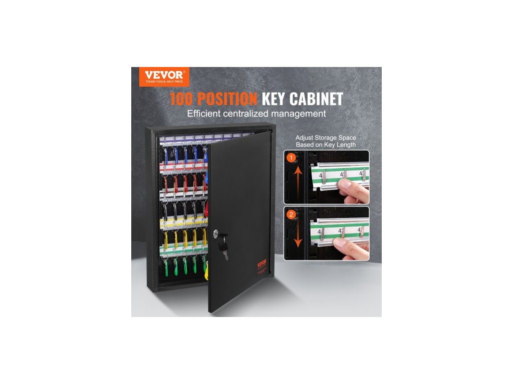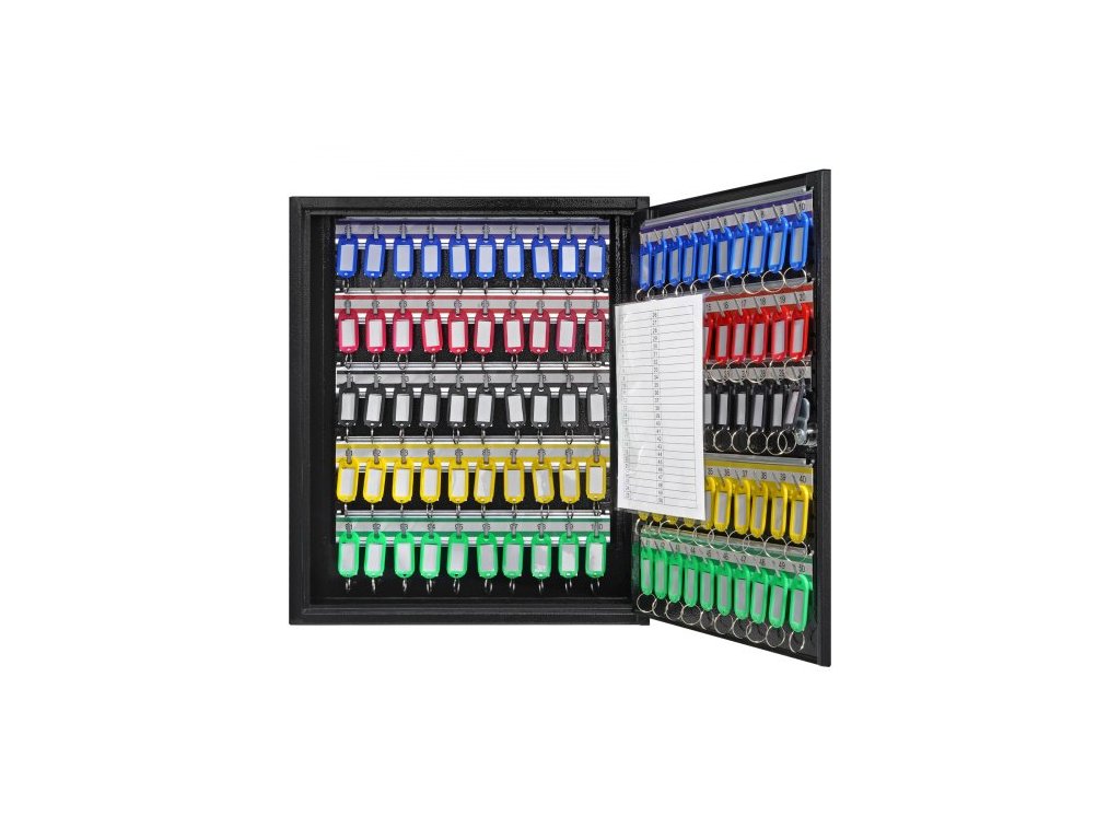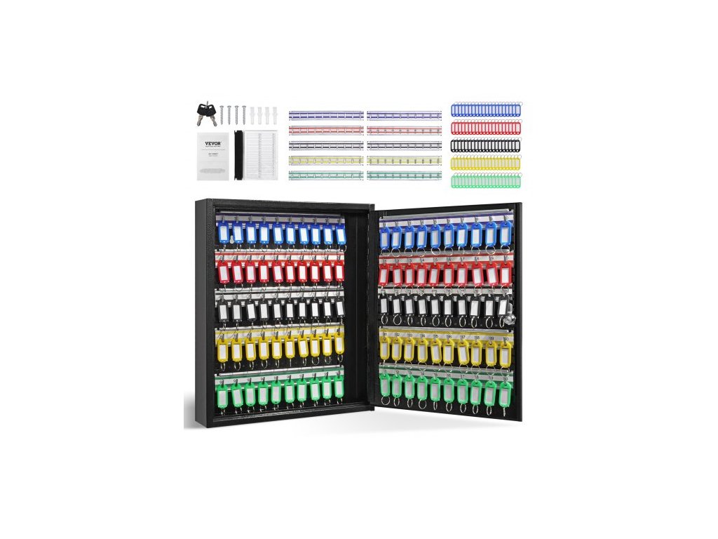 skříňka na 100 klíčů, schránka na klíče s nastavitelnými držáky, bezpečnostní úložná schránka na klíče z oceli, organizér na klíče se 100 barevnými štítky na klíče a 2 záznamovými kartami pro školu, kancelář, hotelPrémiový bezpečnostní zámek