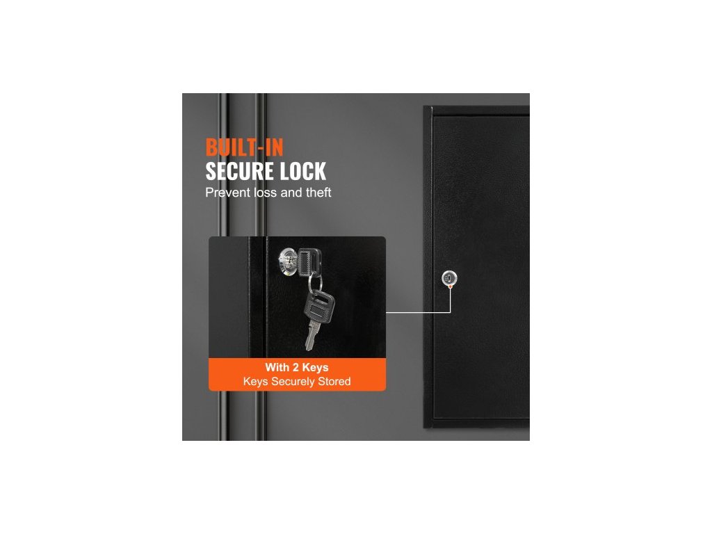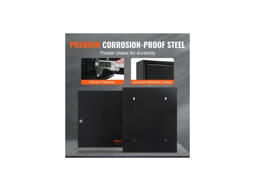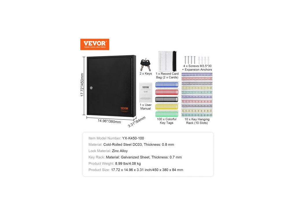 Materiál zámku: slitina zinku, číslo modelu položky: YX-K450-100, hmotnost výrobku: 8,99 lbs/4,08 kg, držák na klíče: materiál: pozinkovaný plech, tloušťka: 0,7 mm, kapacita klíčů: 100 ks, materiál: ocel válcovaná za studena DC03, tloušťka: 0,8 mm, rozměry výrobku: 17,72 x 14,96 x 3,31 palce/450 x 380 x 84 mm