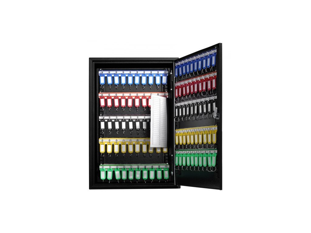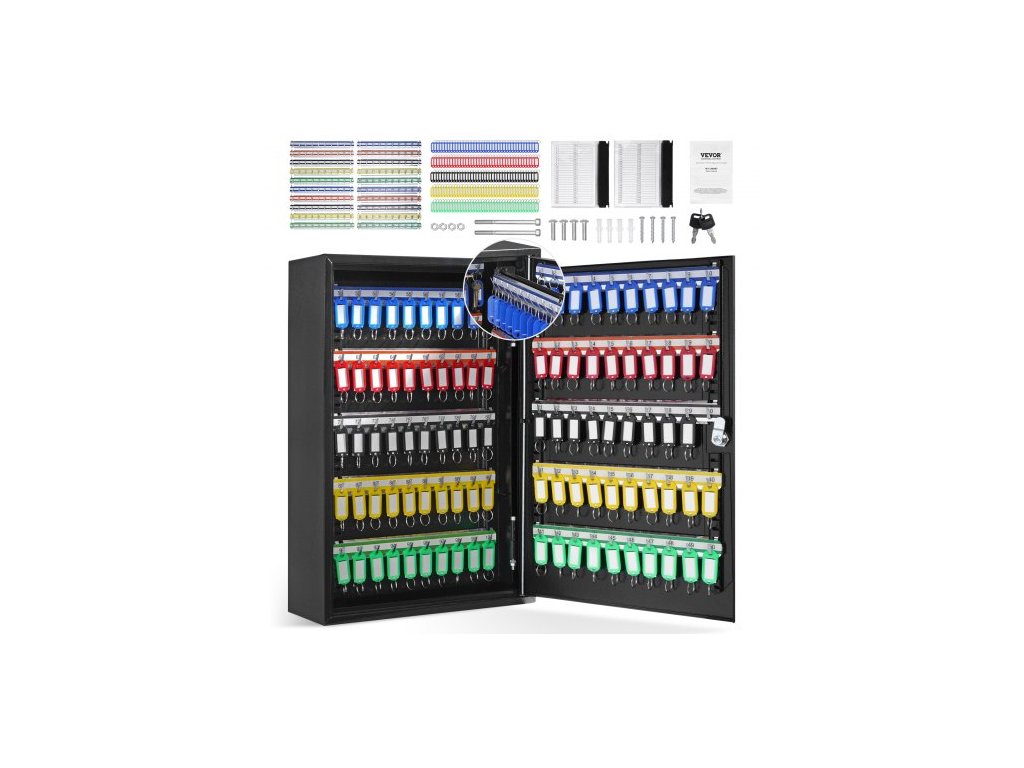 skříňka na 200 klíčů, schránka na klíče s nastavitelnými poličkami, bezpečnostní úložná schránka na klíče z oceli, organizér na klíče s 200 barevnými štítky na klíče a 4 záznamovými kartami do školy, kanceláře, hotelu