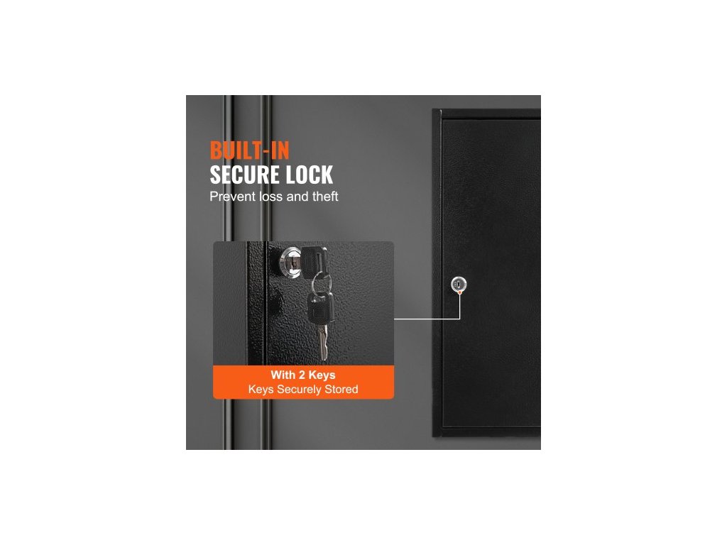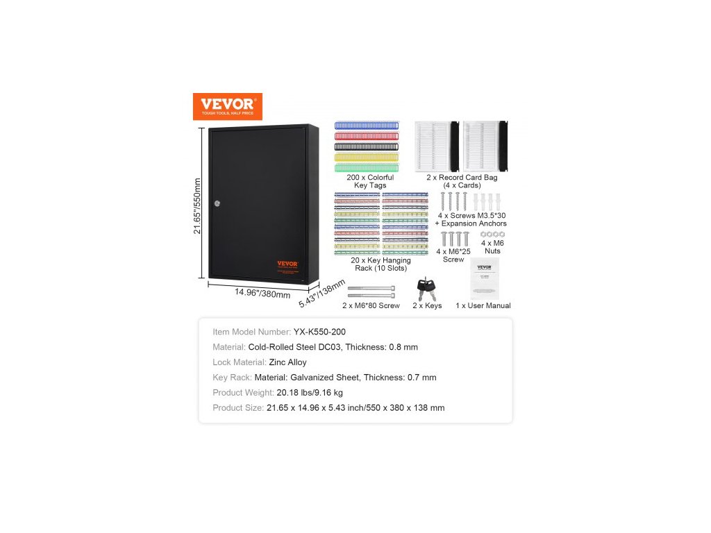 Materiál zámku: slitina zinku, číslo modelu položky: YX-K550-200, hmotnost výrobku: 9,16 kg, držák na klíče: materiál: pozinkovaný plech, tloušťka: 0,7 mm, kapacita klíčů: 200 ks, materiál: ocel válcovaná za studena DC03, tloušťka: 0,8 mm, rozměry výrobku: 550 x 380 x 138 mm
