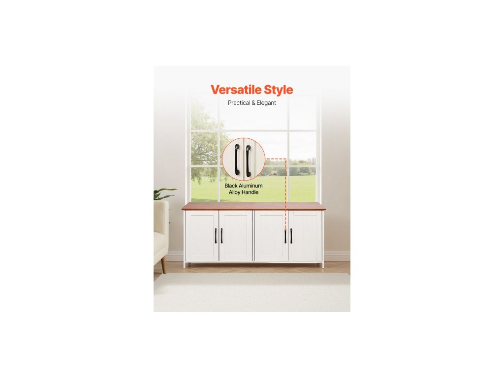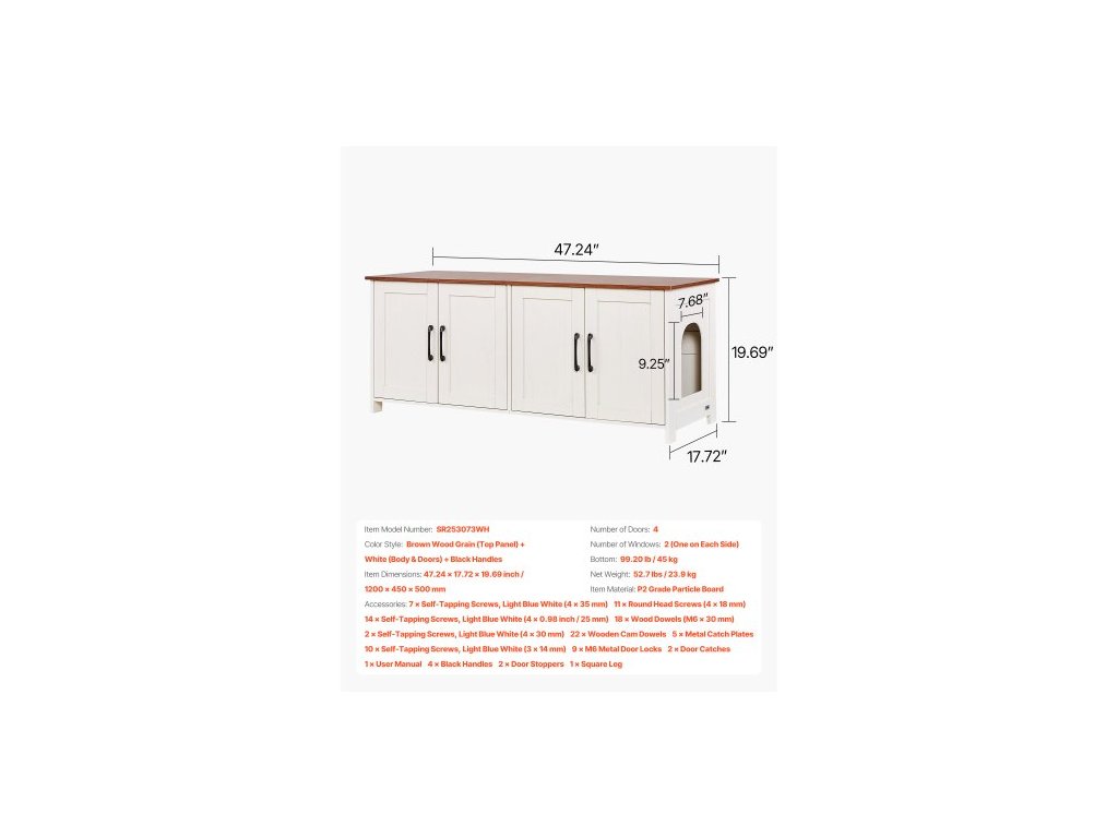Materiál výrobku: Dřevotříska třídy P2: 12 mm, MDF: 15 mm a 5 mm,Výška od podlahy: 125 mm,Nosnost: Nahoře: 60 kg, Spodní: 45 kg,Podpěrné nohy: 5 ks, Výška: 45 mm,Číslo modelu výrobku: SR253073WH,Barevný styl: Hnědá dřevěná kresba (horní panel) + Bílá (tělo a dveře) + Černé kliky,Počet dveří: 4,Rozměry položky: 47,24 × 17,72 × 19,69 palce / 1200 × 450 × 500 mm,Rozměr pravého okna: 9,25 × 7,68 palce / 235 × 195 mm,Počet oken: 2 (jedno na každé straně),Čistá hmotnost: 41,9 lbs / 19 kg