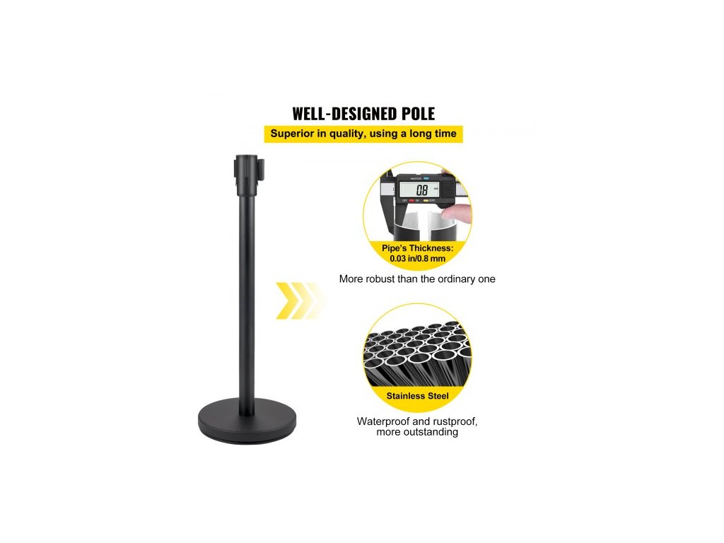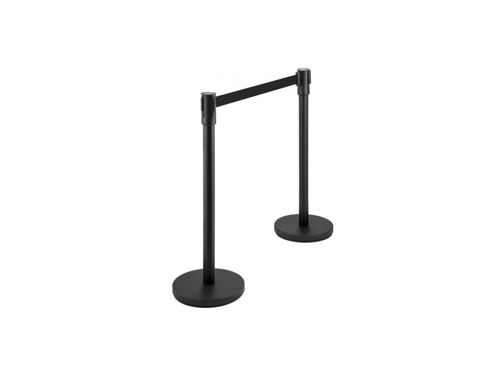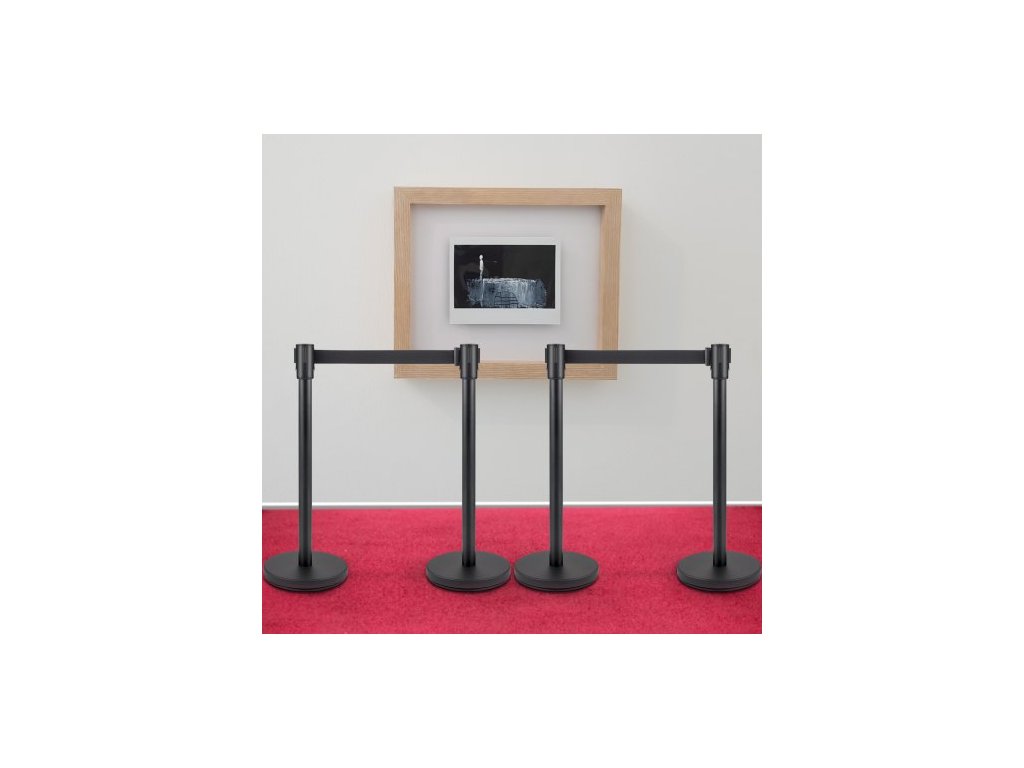 Sloupek pro regulaci davu, Sada 4 kusů sloupků, Sada sloupků s 2m černým zatahovacím pásem, Černá bariéra pro regulaci davu s betonovou a kovovou základnou - Snadná montáž