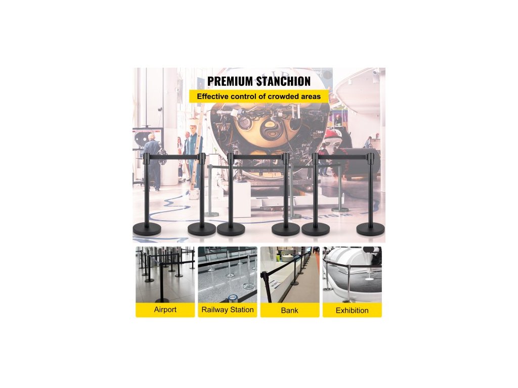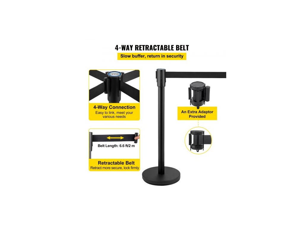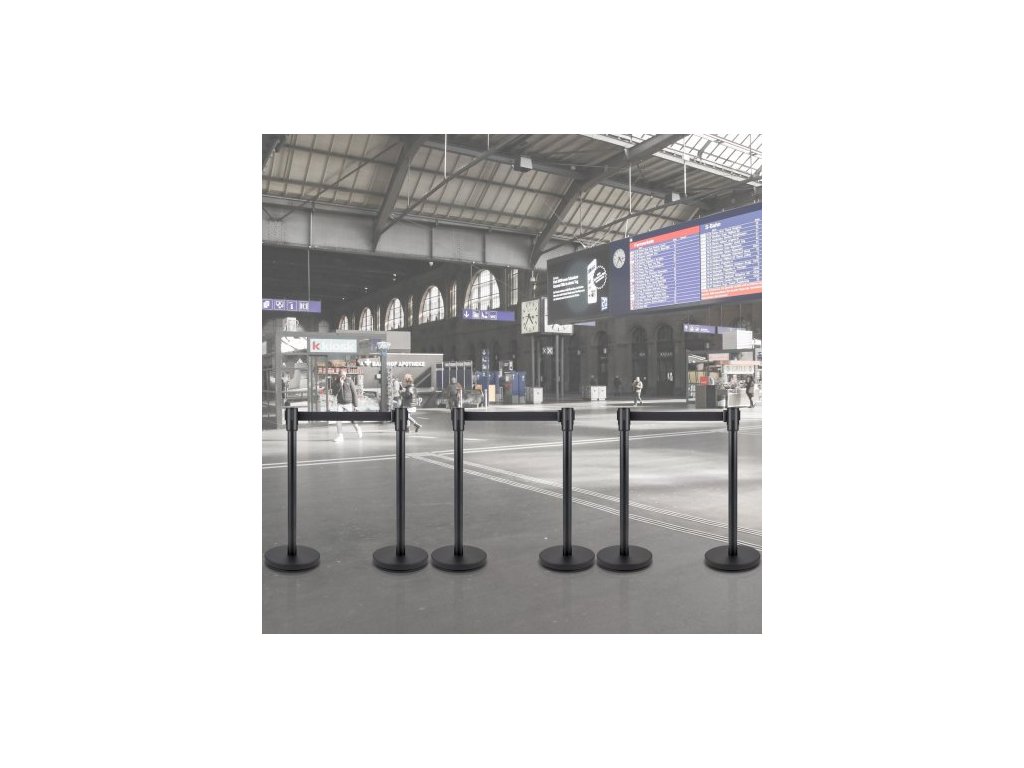 Sloupek pro regulaci davu, sada 6 kusů, sada sloupků s 2m černým zatahovacím pásem, černá zábrana pro regulaci davu s betonovou a kovovou základnou - snadná montáž