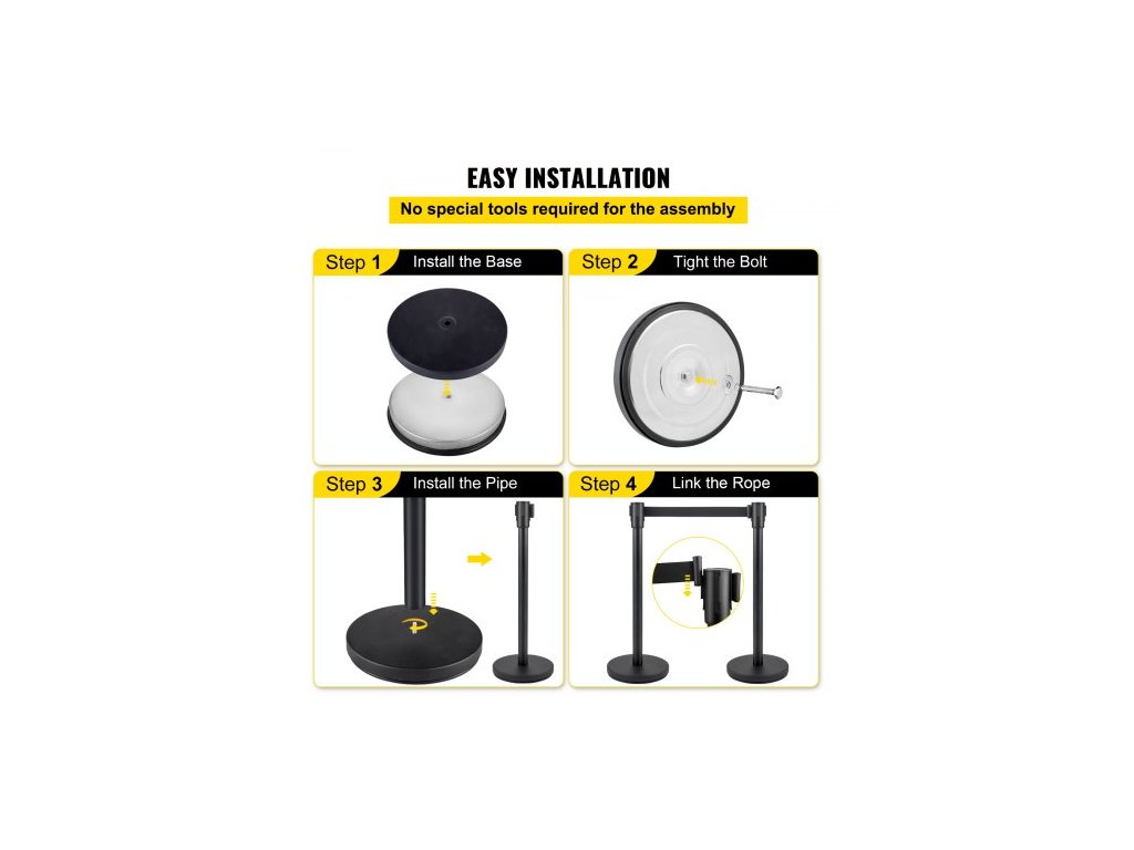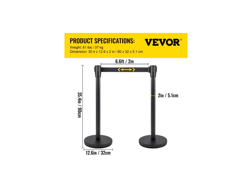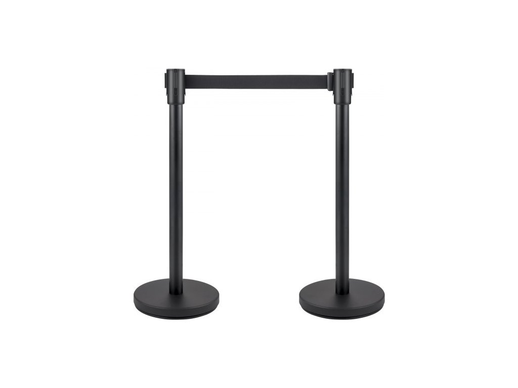 Sloupek pro regulaci davu, sada 6 kusů, sada sloupků s černým zatahovacím pásem 2 m, černá bariéra pro regulaci davu s betonovou a kovovou základnou - snadná montážMateriál ocel a železo