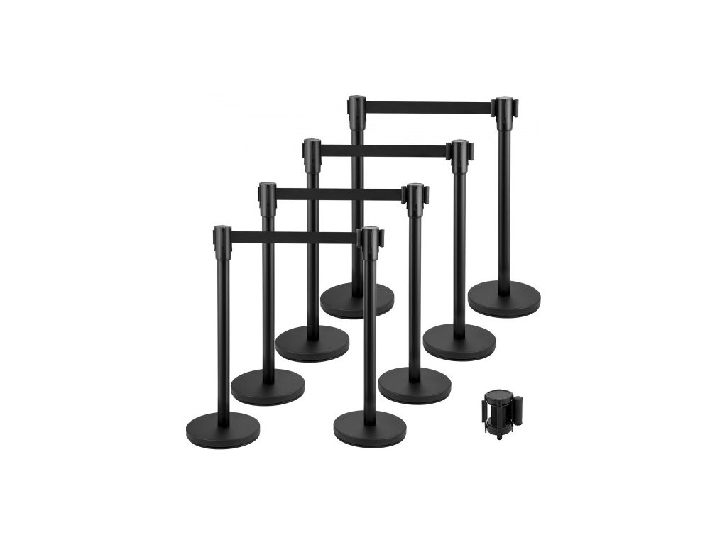 Sloupek pro regulaci davu, sada 8 kusů, sada sloupků s černým zatahovacím pásem 2 m, černá zábrana pro regulaci davu s betonovou a kovovou základnou – snadná montážOdolná konstrukce