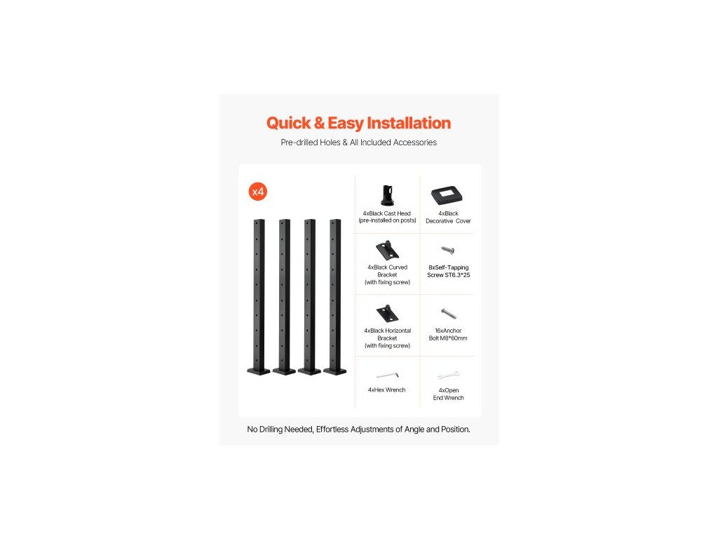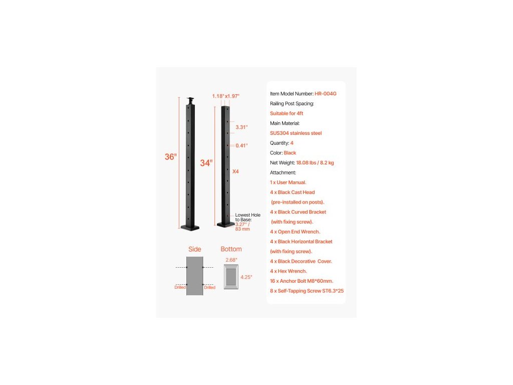 Počet otvorů: 10, Čistá hmotnost (včetně příslušenství): 18,07 liber/8,2 kg (±3 %), Barva: Černá, Číslo modelu položky: HR-004G, Množství: 4, Rozteč sloupků zábradlí: Vhodné pro výšky až 4 stopy, Hlavní materiál: Nerezová ocel SUS304