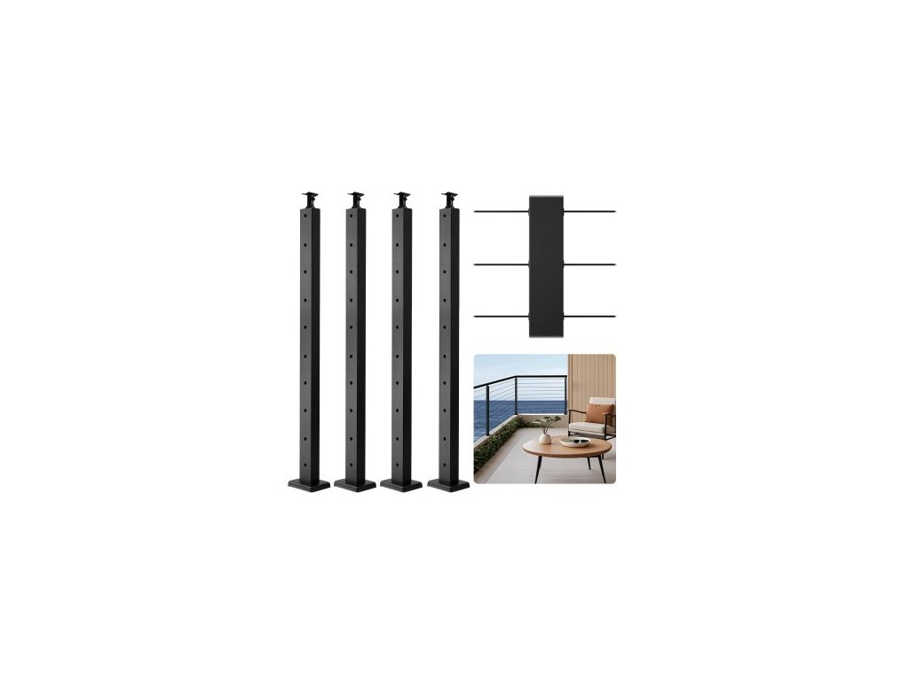 Sloupek zábradlí 4 kusů, sloupek zábradlí na kabely, 36x1x2 palce s horizontálními otvory a předvrtanými otvory, nerezový sloupek zábradlí na kabely s horizontální a zakřivenou konzolou, černý, 4JZLGZXHS914UUOI6001V0Sloupek zábradlí s horizontálními otvory