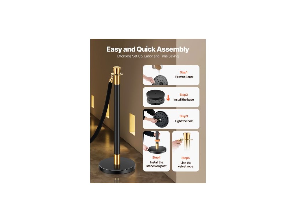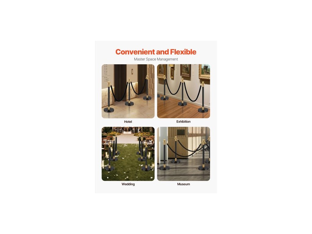 Sloupky, 6 kusů zábran pro kontrolu davu se 4 černými sametovými lany, fronta z nerezové oceli o délce 5 stop s dutou základnou pro vstřikování písku pro divadlo, večírek, svatbu, výstavu, černáElegantní a odolná
