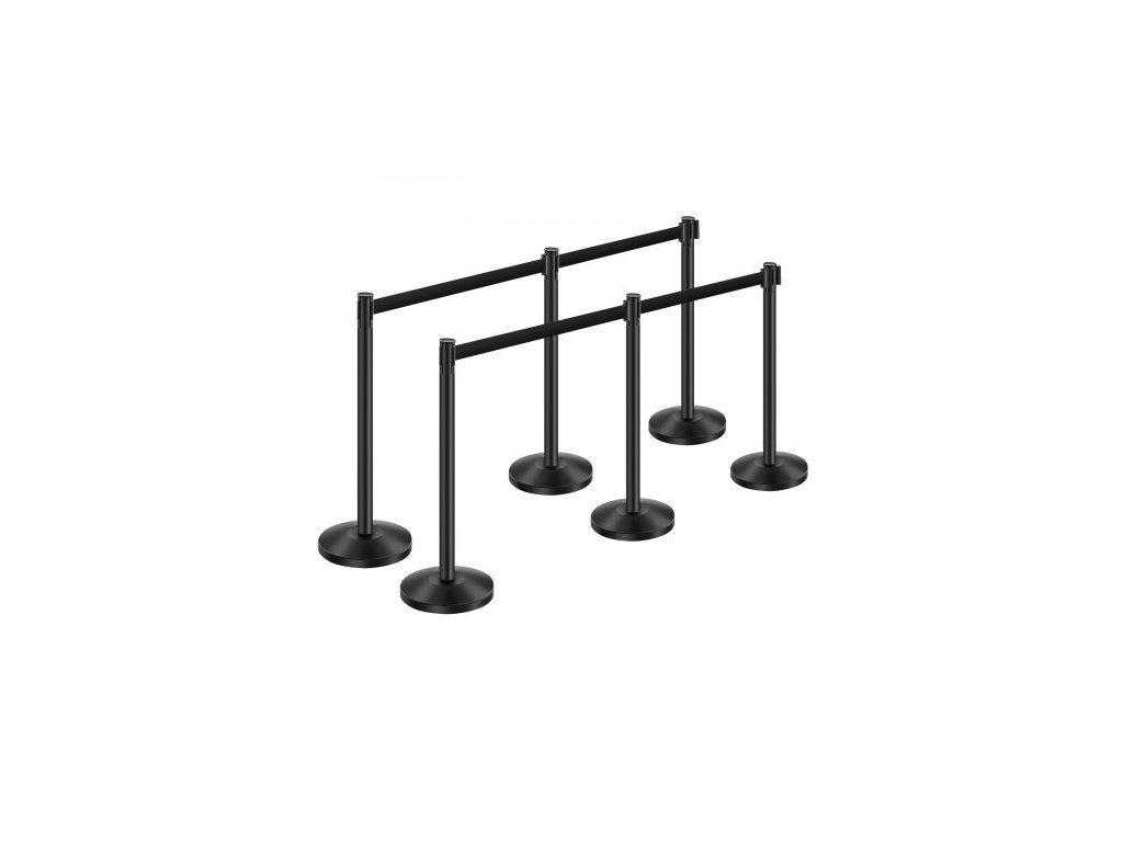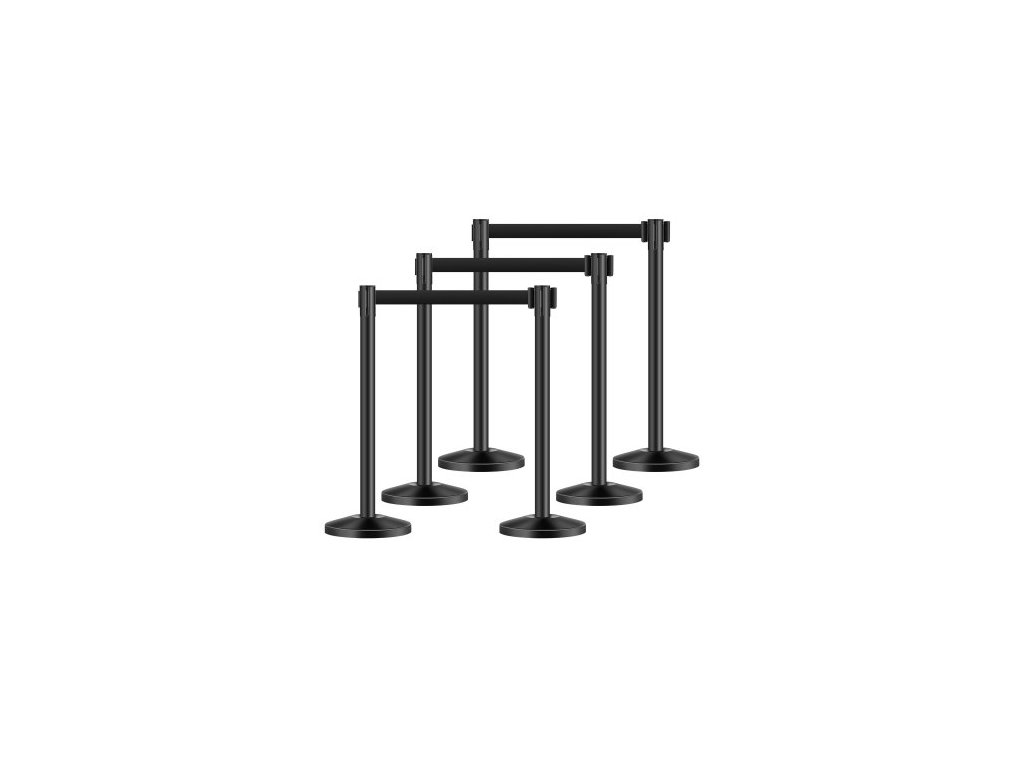 Sloupky, 6dílná zábrana proti davu se 6 zatahovacími pásy, fronta z uhlíkové oceli, černá, s dutou základnou z pískové vstřikovací hmoty pro divadla, večírky, svatby, výstavy, černá