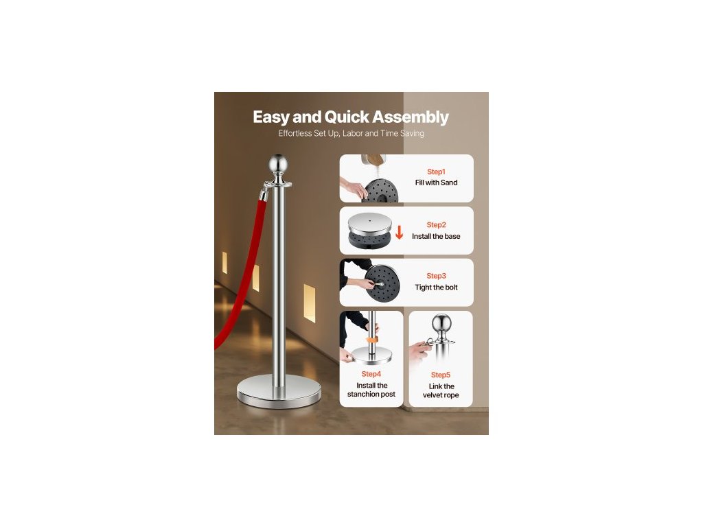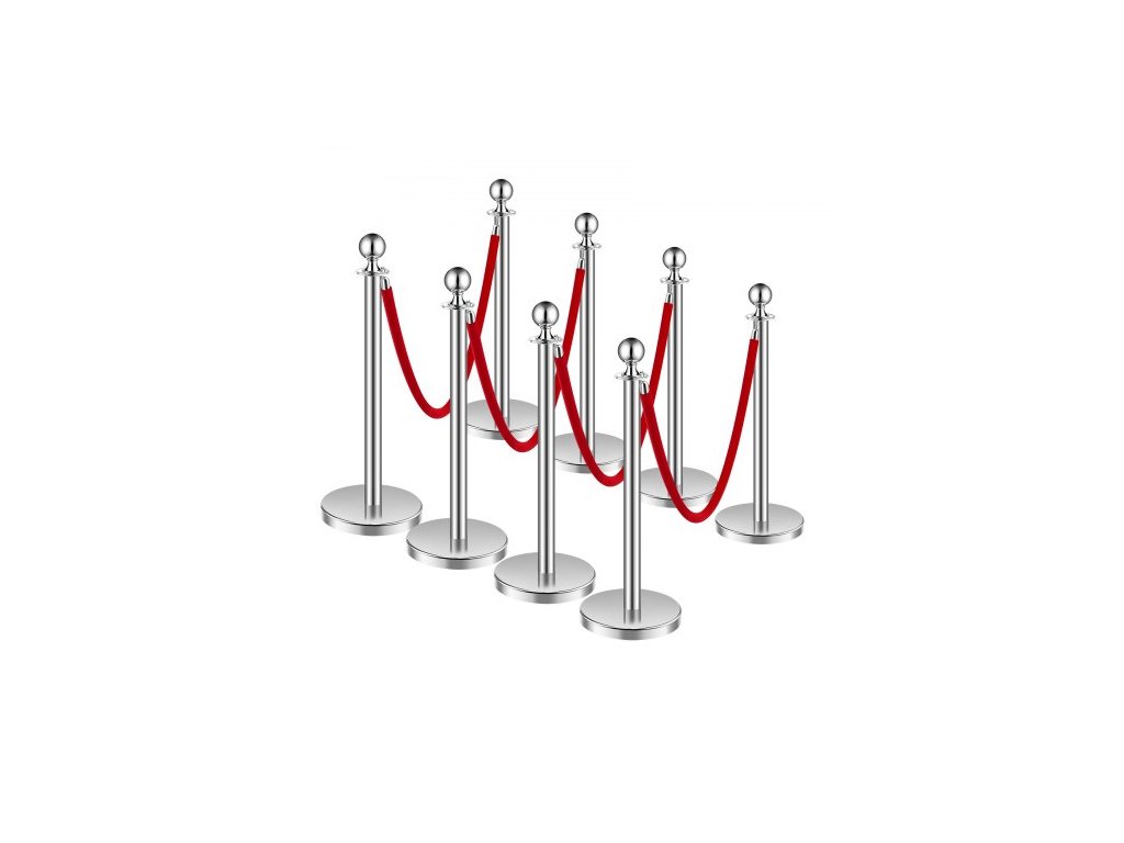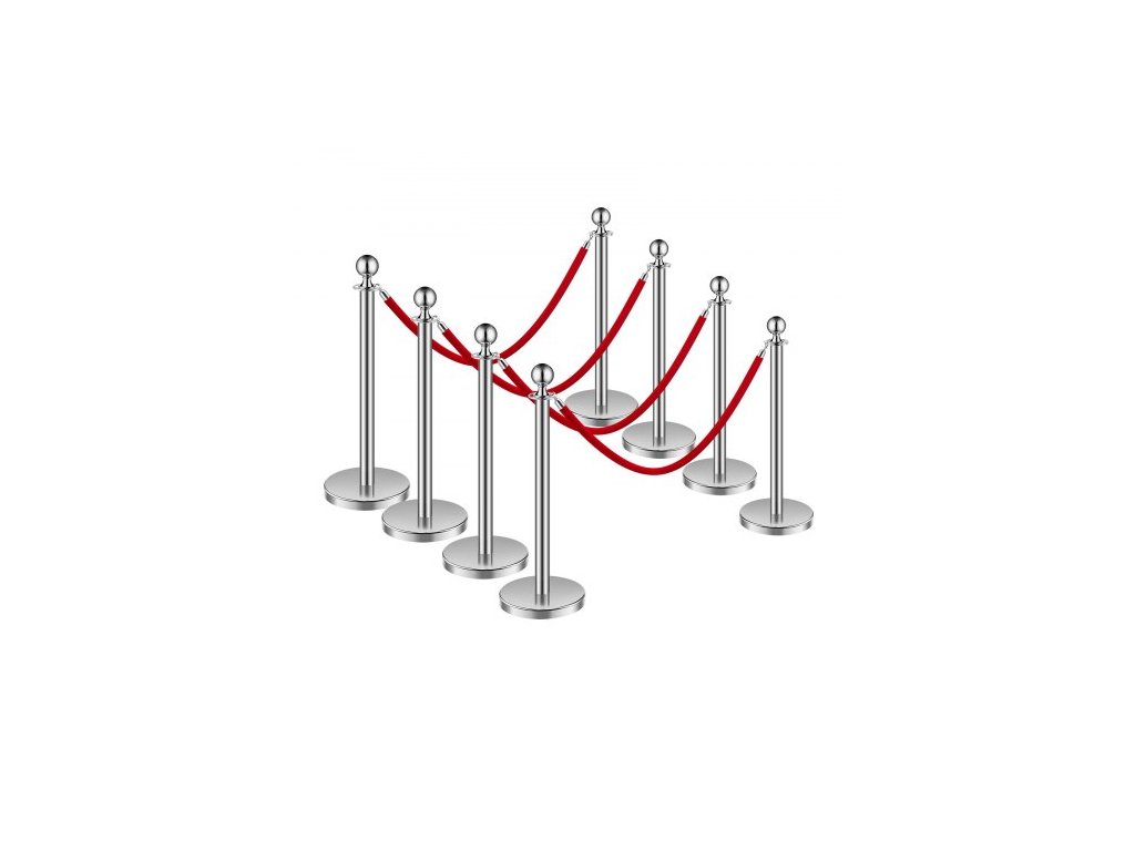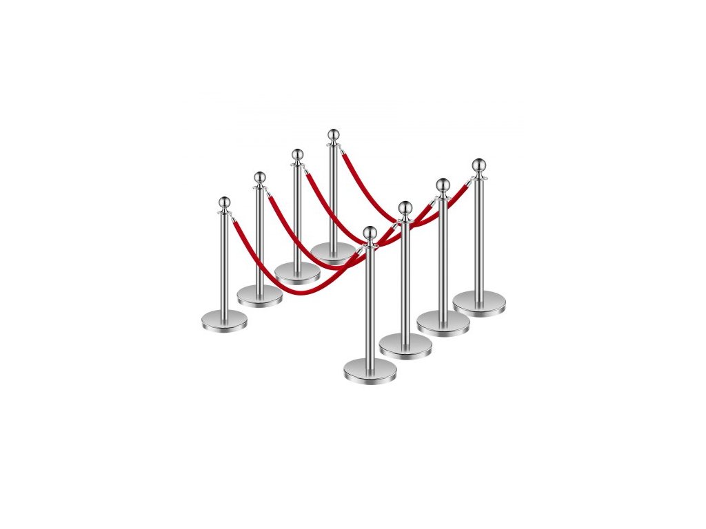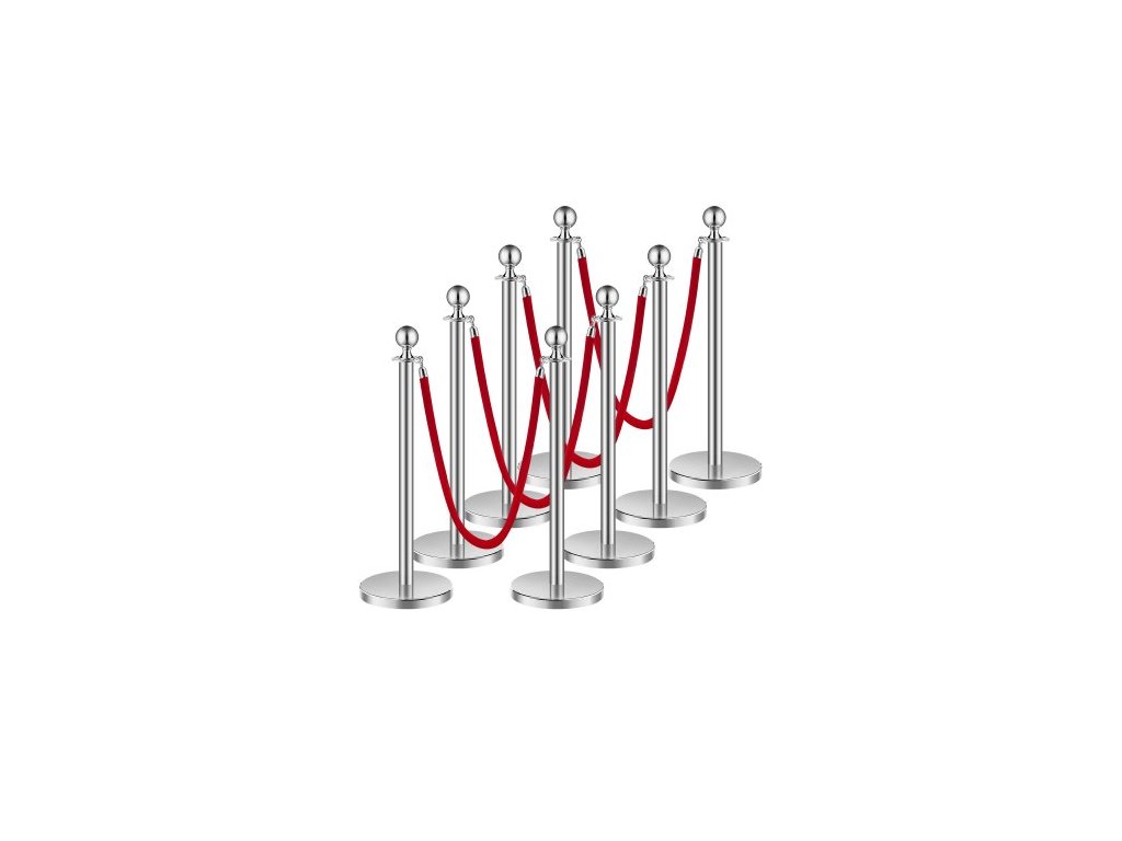 Sloupky, sada 8 kusů pro regulaci davu se 4 červenými sametovými lany, fronta ze stříbrných sloupků z nerezové oceli o délce 5 stop s dutou základnou pro vstřikování písku pro divadlo, večírek, svatbu, výstavuElegantní a odolná